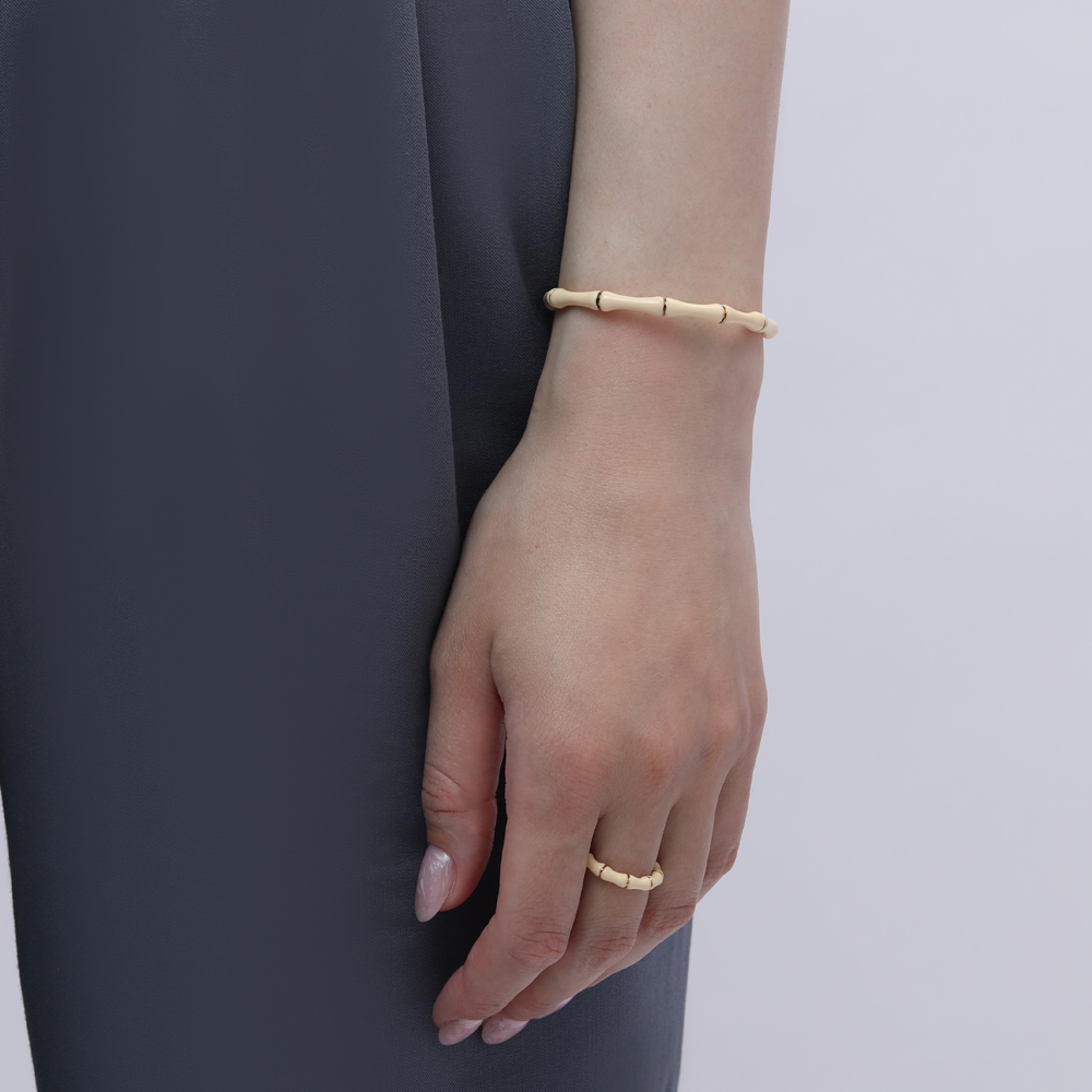 Описание: Изготовлено из ювелирного сплава на основе латуни с гальваническим покрытием золотом. Изделие украшает эмаль бежевого цвета. Ширина 6мм.