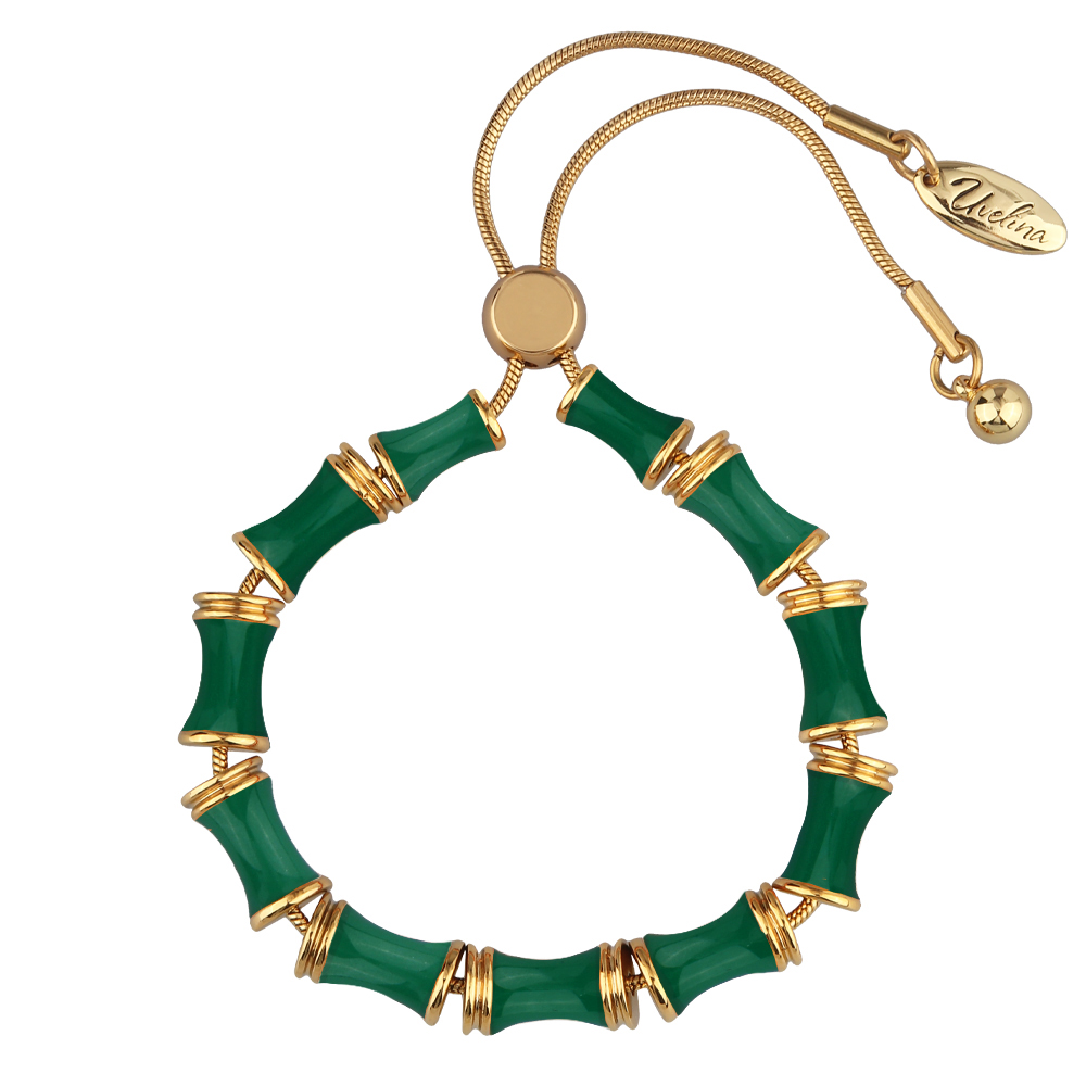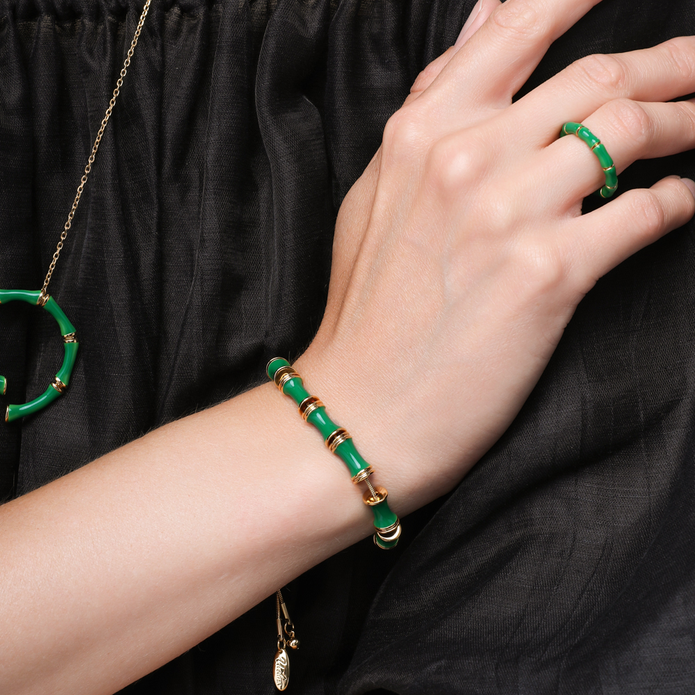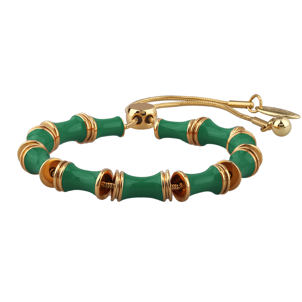 Описание: Изготовлено из ювелирного сплава на основе латуни с гальваническим покрытием золотом. Изделие украшает зеленая эмаль. На браслете установлен регулятор длины. Максимальная длина 23см.