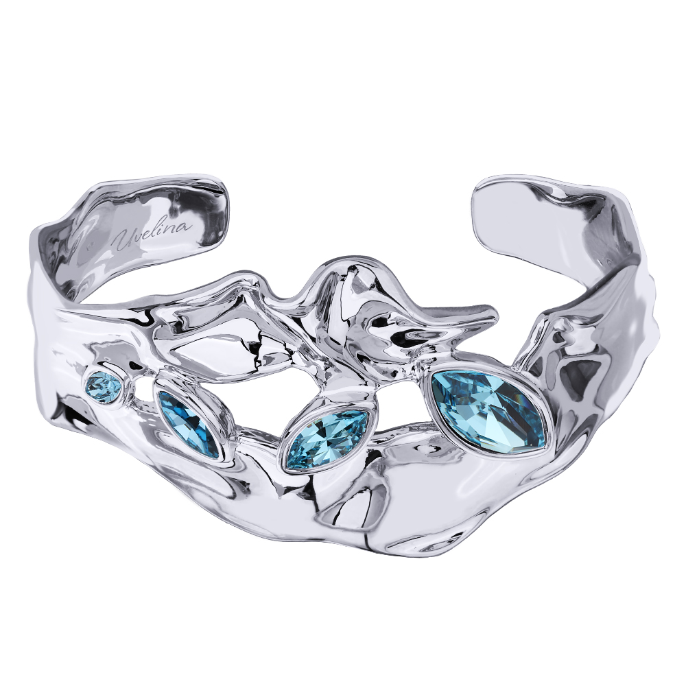Описание: Изготовлено из ювелирного сплава на основе латуни с гальваническим покрытием родием. Изделие украшают кристаллы SW цвета аквамарин. Ширина 3.5см.