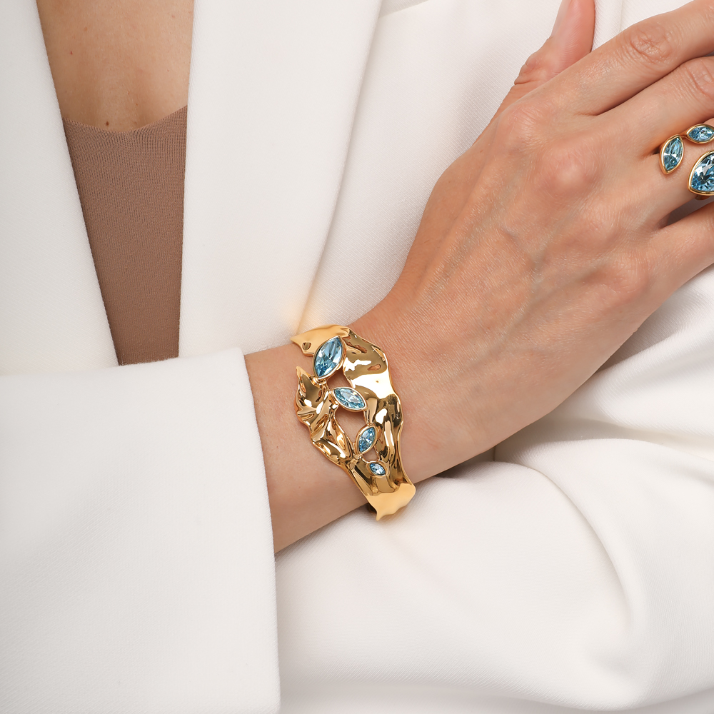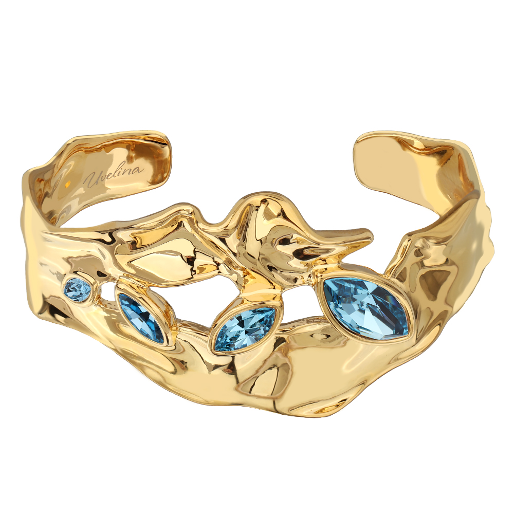 Описание: Изготовлено из ювелирного сплава на основе латуни с гальваническим покрытием золотом. Изделие украшают кристаллы SW цвета аквамарин. Ширина 3.5см.