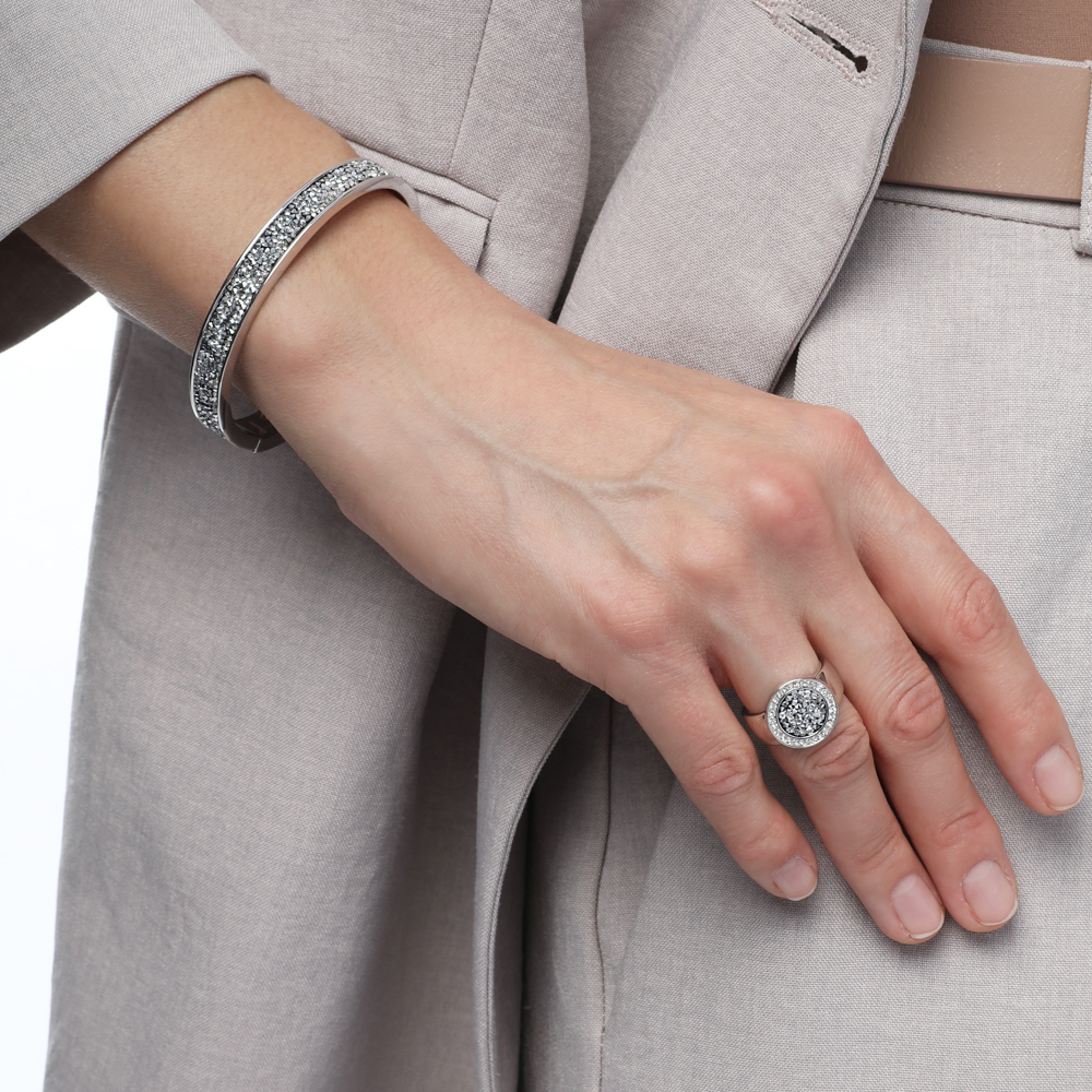 Описание: Изготовлено из ювелирного сплава на основе латуни с гальваническим покрытием родием. Изделие украшают кристаллы SW серебристо-белого цвета. Ширина браслета 8мм. Пружинный механизм отвода.