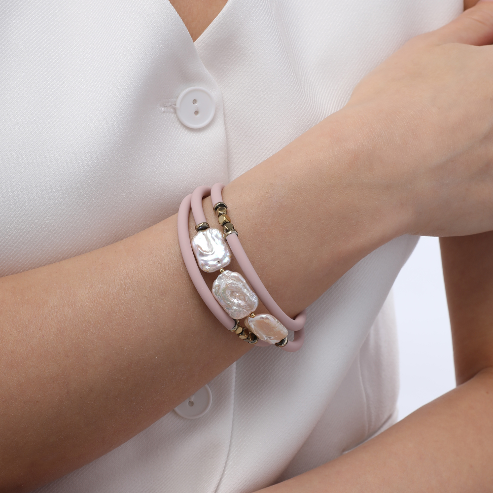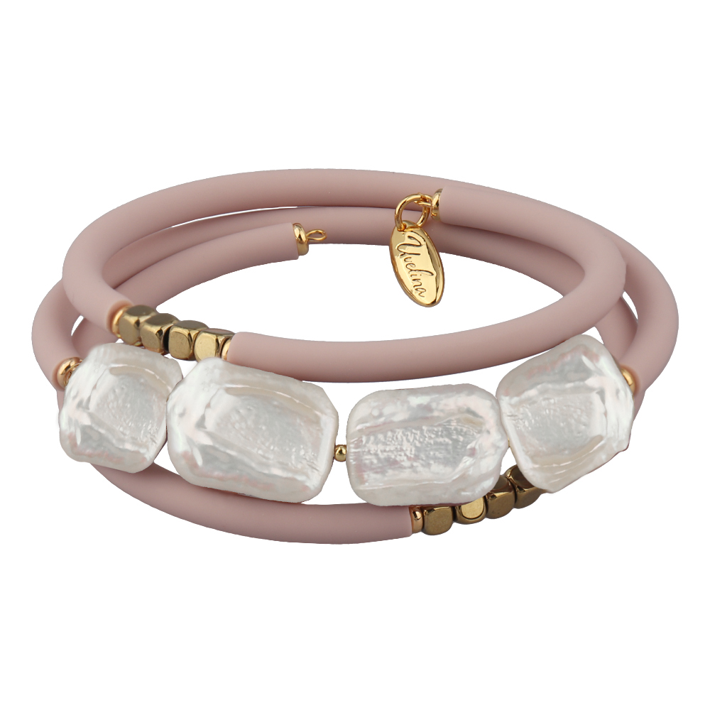 Описание: Изготовлено из ювелирного сплава на основе латуни с гальваническим покрытием золотом. Изделие украшают жемчуг белого цвета и розовый каучуковый шнурок.