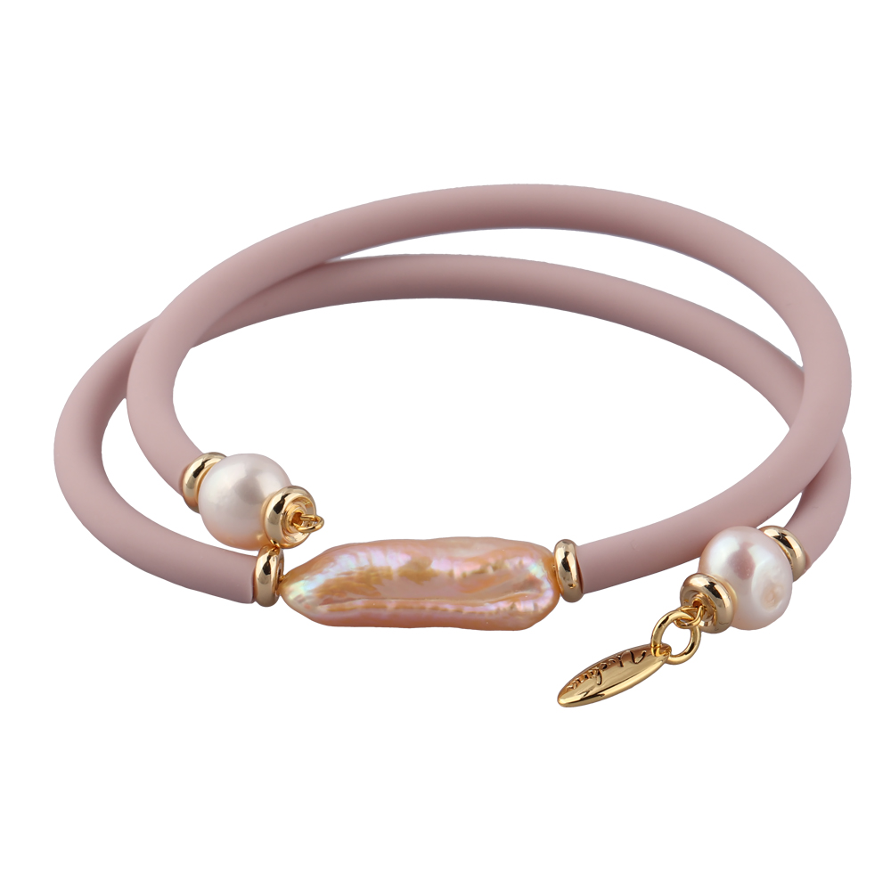 Описание: Изготовлено из ювелирного сплава на основе латуни с гальваническим покрытием золотом. Изделие украшают барочный жемчуг розового цвета и розовый каучуковый шнурок. *Цвет и форма жемчужин может отличаться от изображенной на фото.