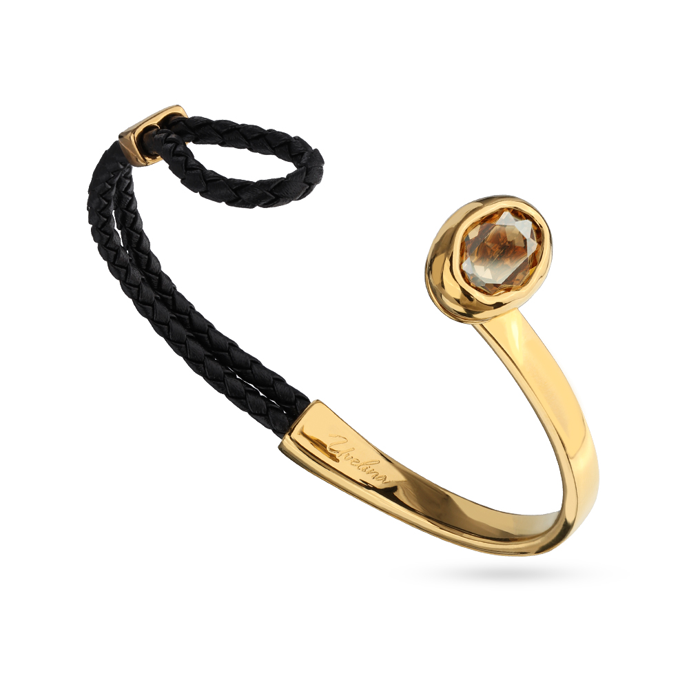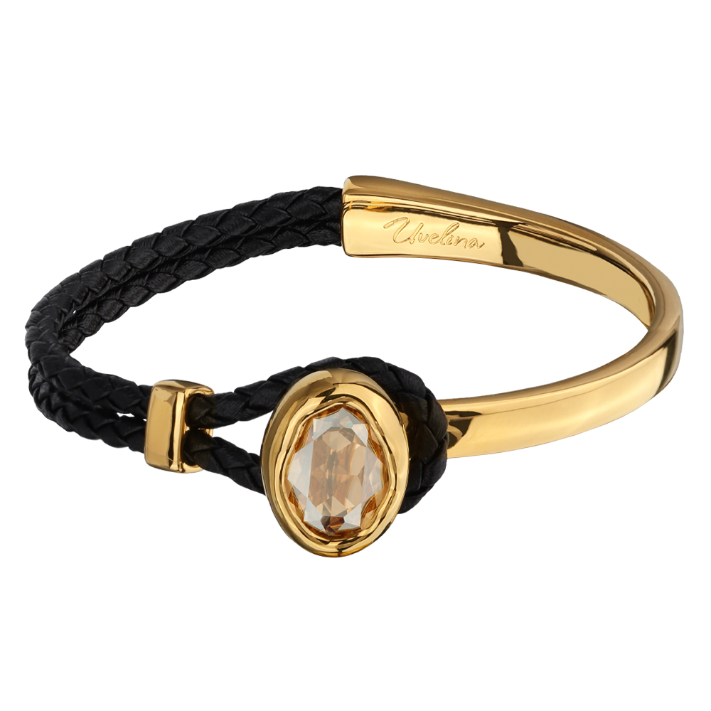 Описание: Изготовлено из ювелирного сплава на основе латуни с гальваническим покрытием золотом. Изделие украшают кристаллы SW цвета шампань и черная кожа. Размер украшения 17х13мм. Длина браслета 17см.