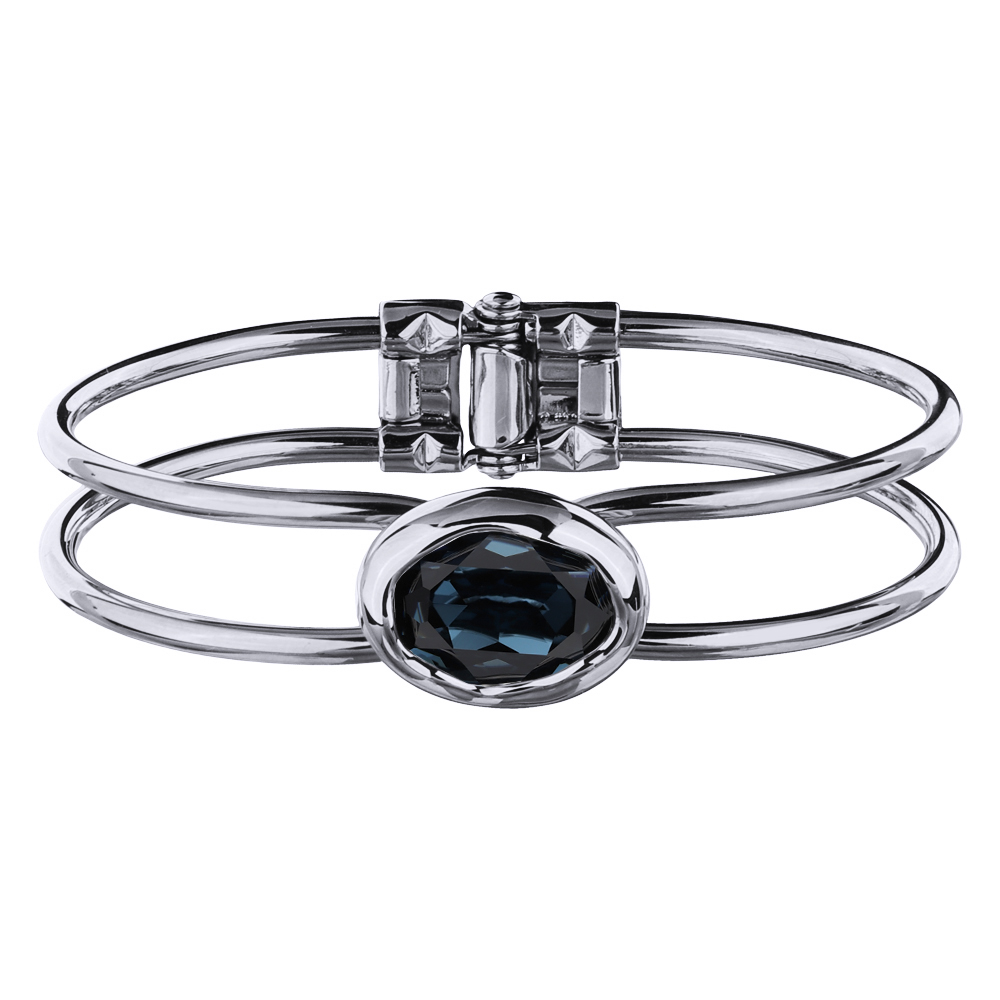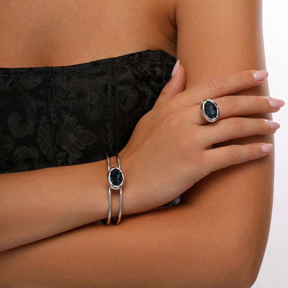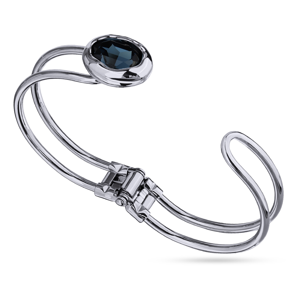 Описание: Изготовлено из ювелирного сплава на основе латуни с гальваническим покрытием родием. Изделие украшают кристаллы SW темно-синего цвета. Размер кристалла 18х13мм. Размер браслета 6.2х4.5см.