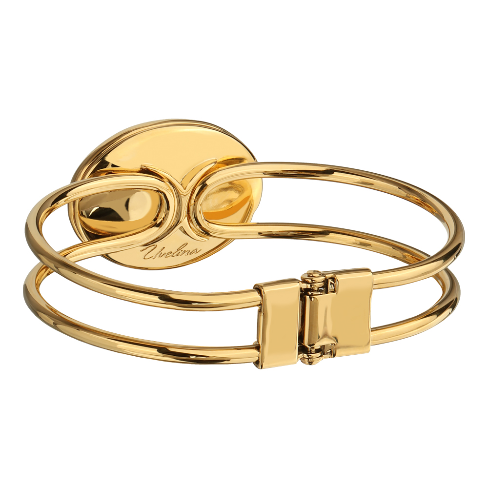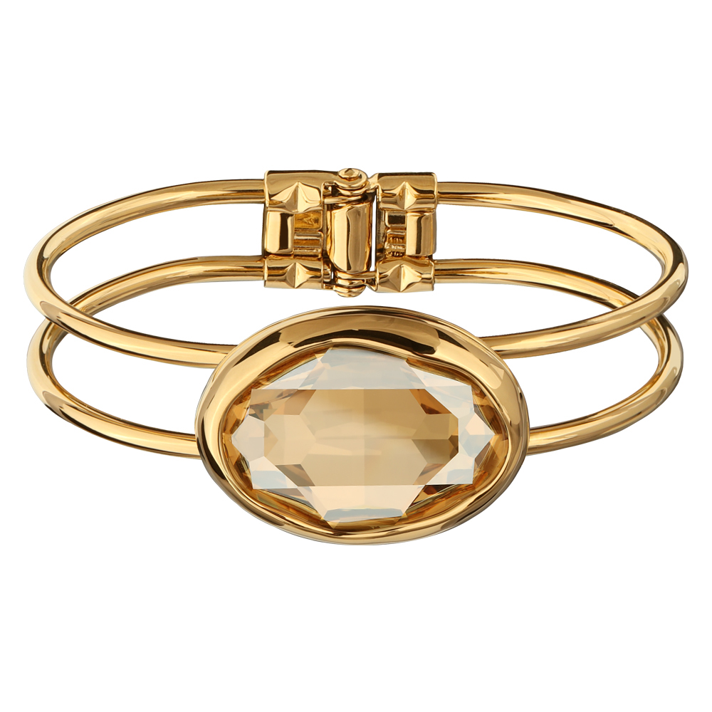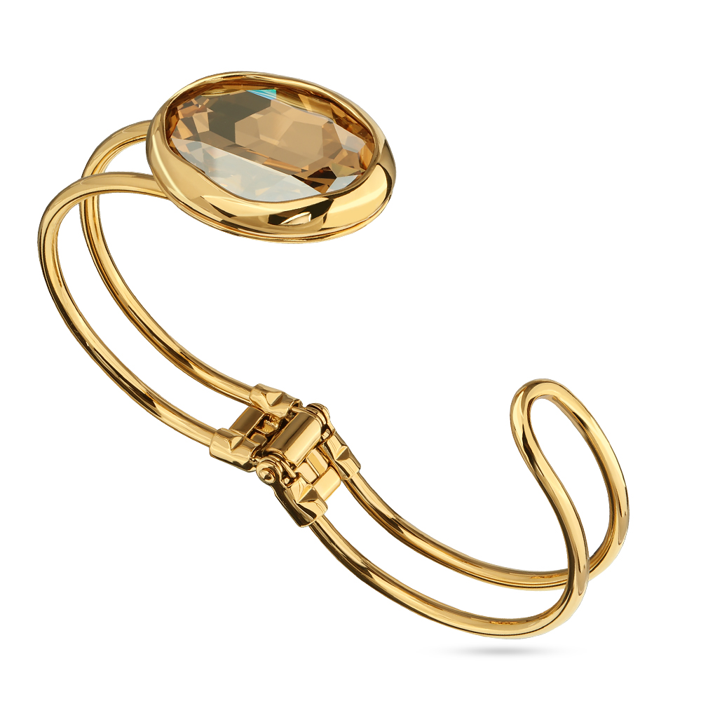 Описание: Изготовлено из ювелирного сплава на основе латуни с гальваническим покрытием золотом. Изделие украшают кристаллы SW шампань цвета. Размер кристалла 30х22мм. Размер браслета 6.2х4.5см.