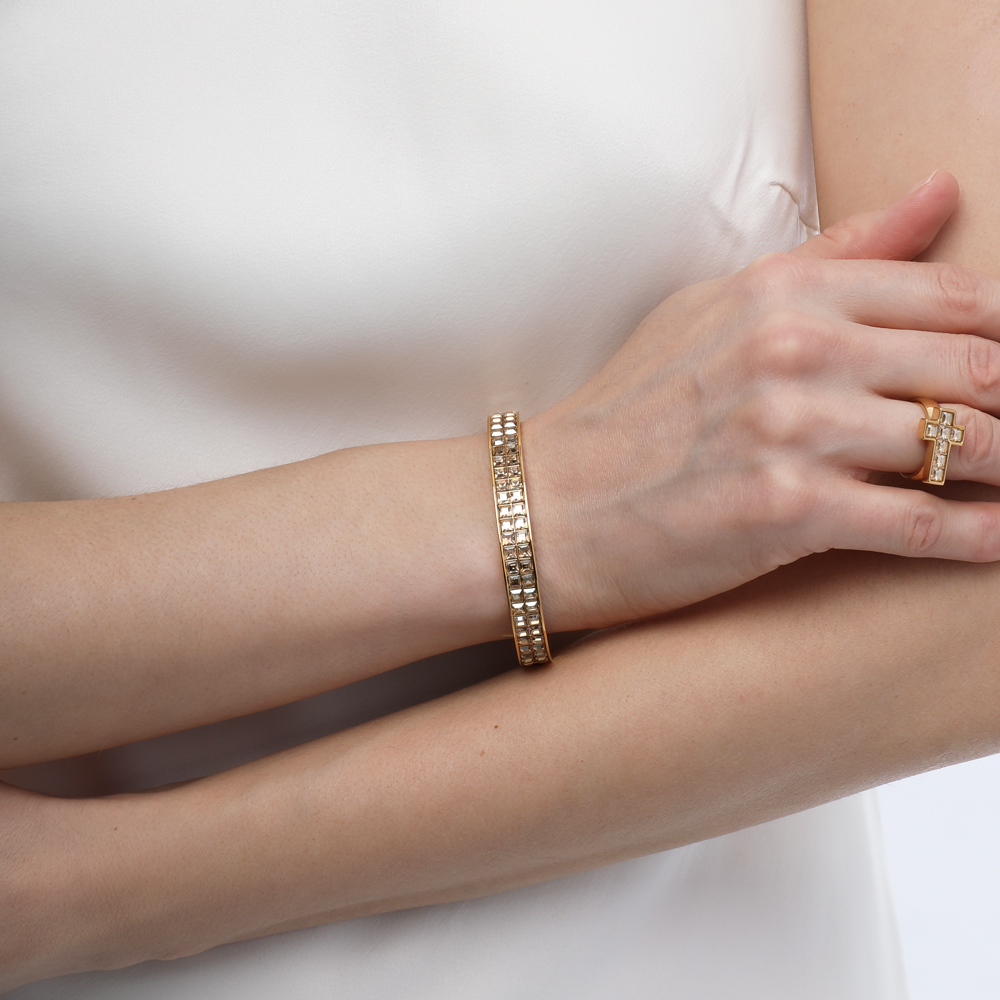 Описание: Изготовлено из ювелирного сплава на основе латуни с гальваническим покрытием золотом. Изделие украшают кристаллы SW цвета шампань. Пружинный механизм отвода. Ширина браслета 0, 8см.