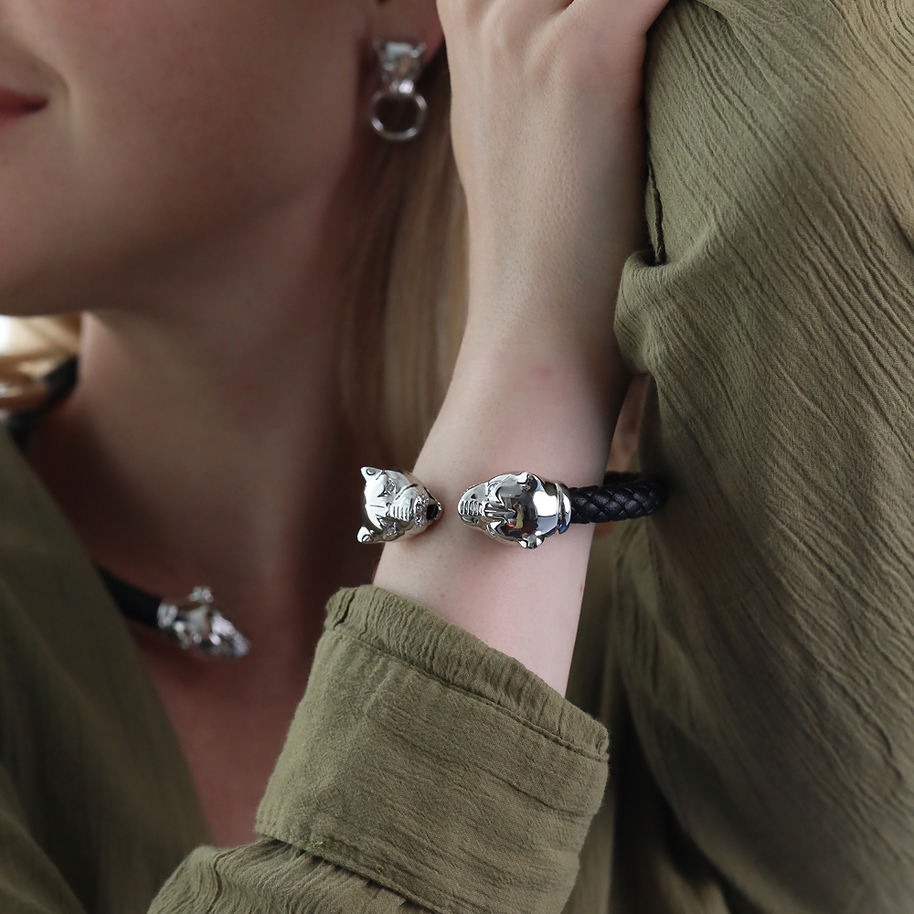 Описание: Изготовлено из ювелирного сплава на основе латуни с гальваническим покрытием родием. Изделие украшают белые кристаллы SW. Длина черного кожаного шнурка 17см.