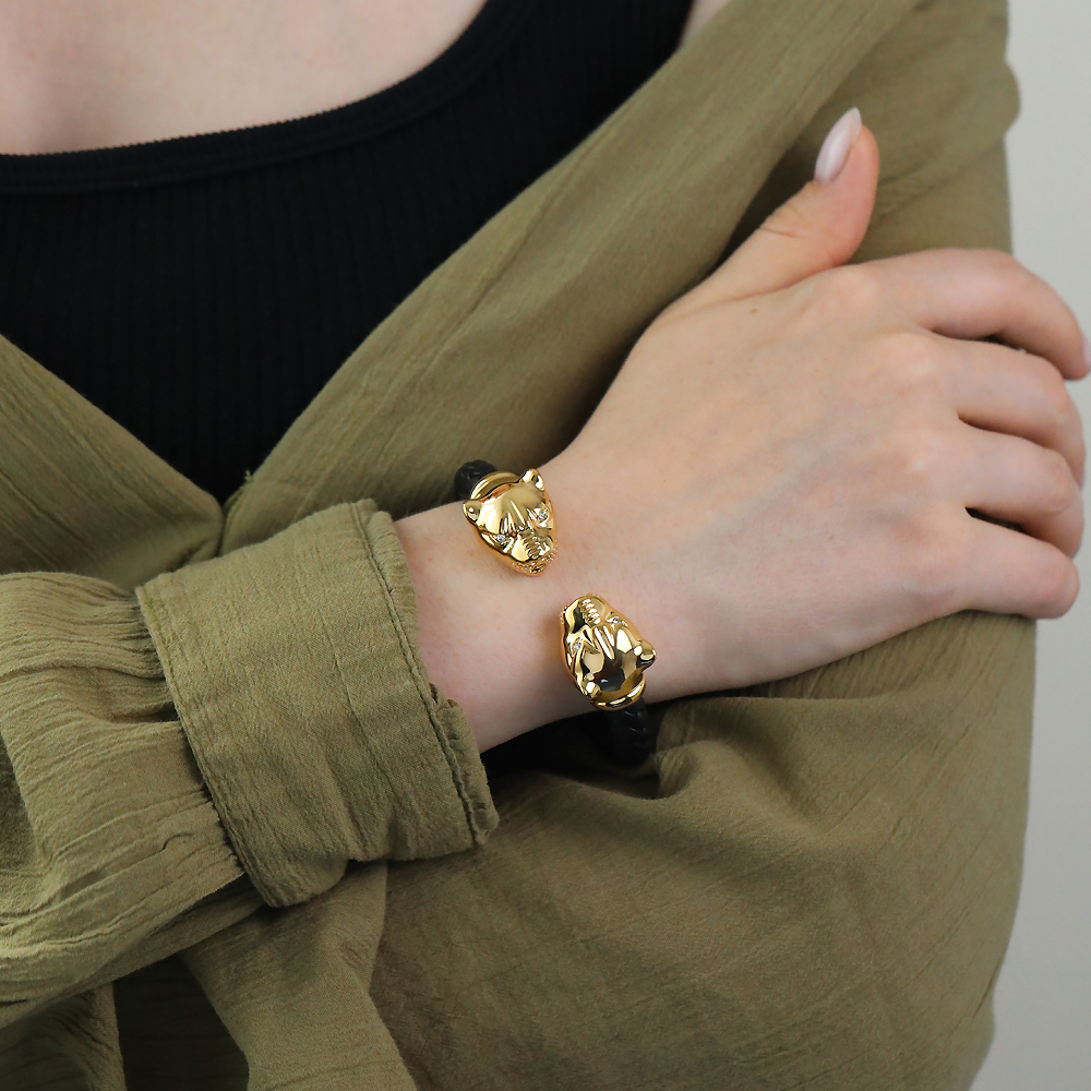 Описание: Изготовлено из ювелирного сплава на основе латуни с гальваническим покрытием золотом. Изделие украшают белые кристаллы SW. Длина черного кожаного шнурка 17см.