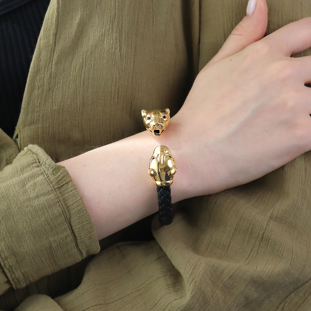 Описание: Изготовлено из ювелирного сплава на основе латуни с гальваническим покрытием золотом. Изделие украшают черные кристаллы SW. Длина черного кожаного шнурка 17см.