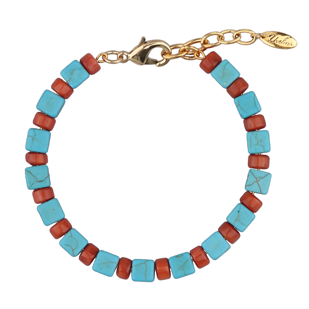 Описание: Изготовлено из ювелирного сплава на основе латуни с гальваническим покрытием золотом. Изделие украшает натуральные бирюза диаметром 6мм и корал диаметром 3мм. Длина 18см. Замок-карабин с удлинителем 3см.