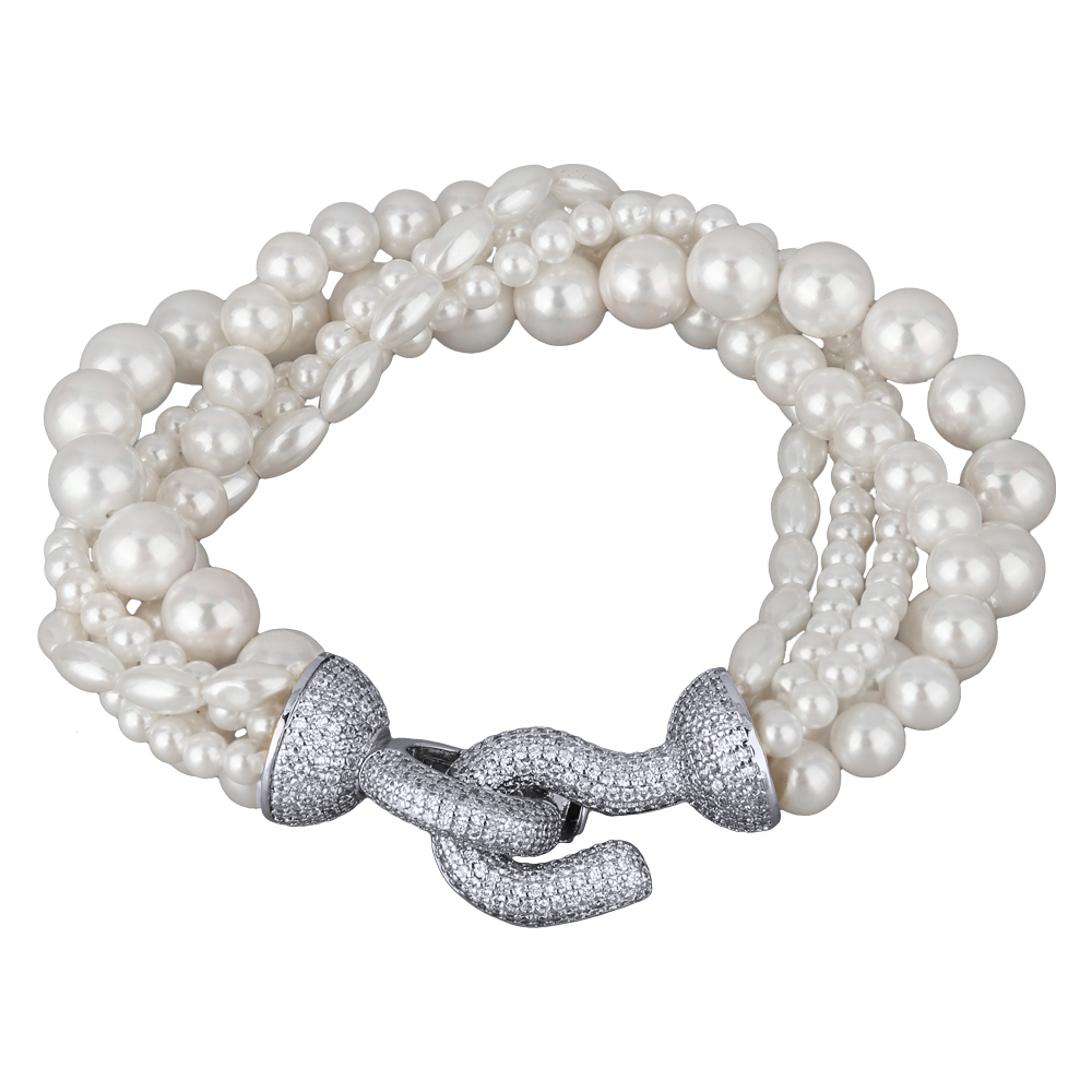 Описание: Изготовлено из ювелирного сплава на основе латуни с гальваническим покрытием родием. Изделие украшают жемчуг Майорка диаметром 4-6мм и белый фианит Длина 20см.