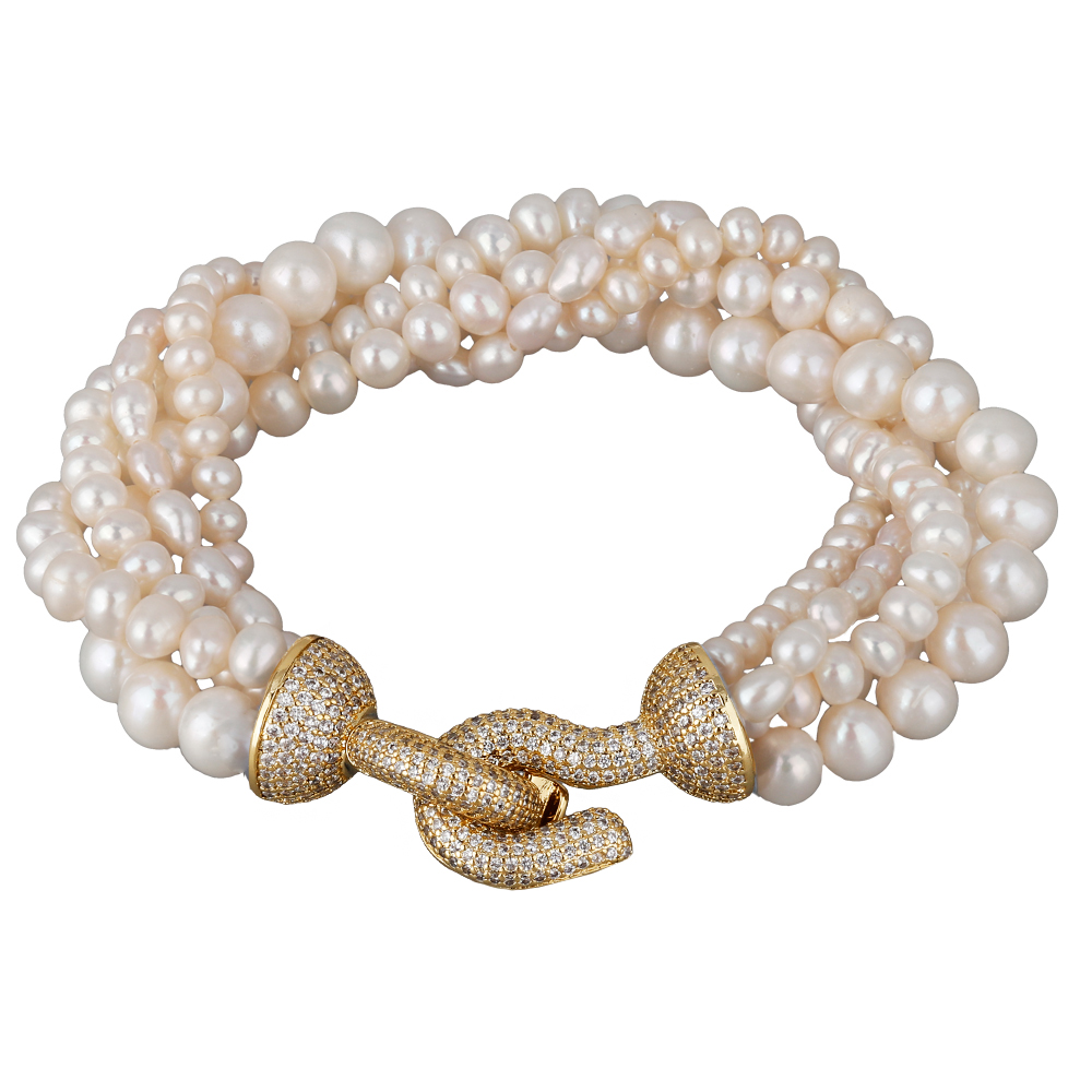 Описание: Изготовлено из ювелирного сплава на основе латуни с гальваническим покрытием золотом. Изделие украшают жемчуг диаметром 5мм и цирконы белого цвета. Длина 20см.