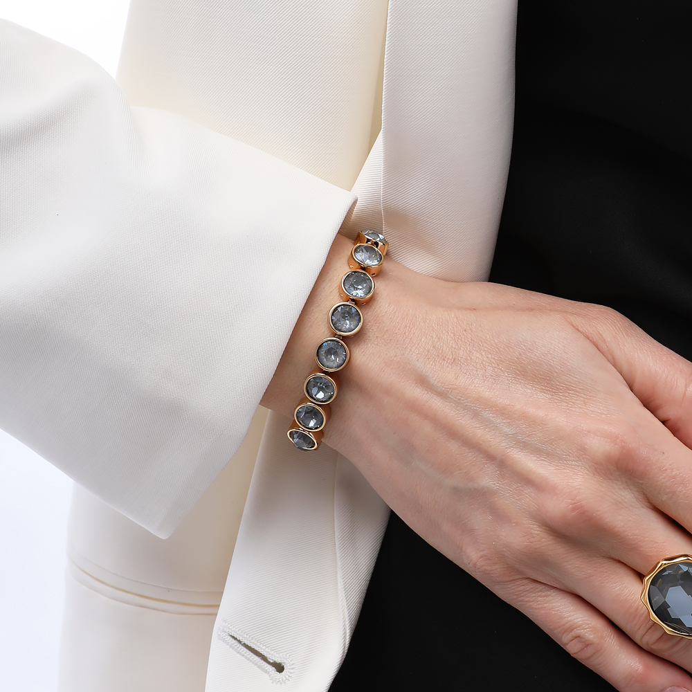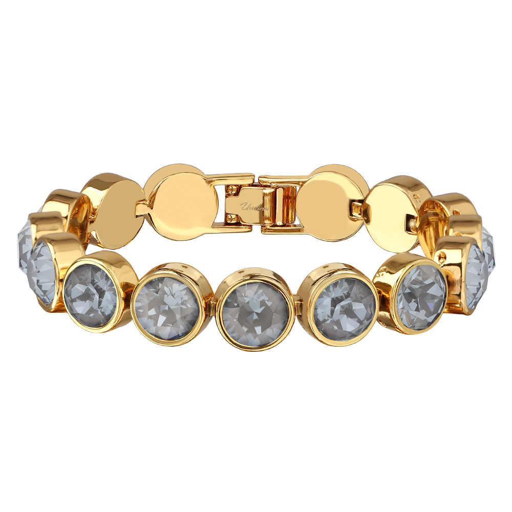 Описание: Изготовлено из ювелирного сплава на основе латуни с гальваническим покрытием золотом. Изделие украшают кристаллы SW дымчато-серого цвета диаметром 8мм. Длина 17-20см.