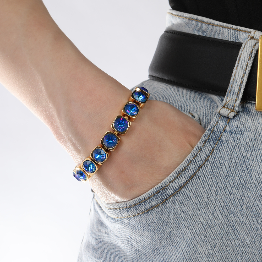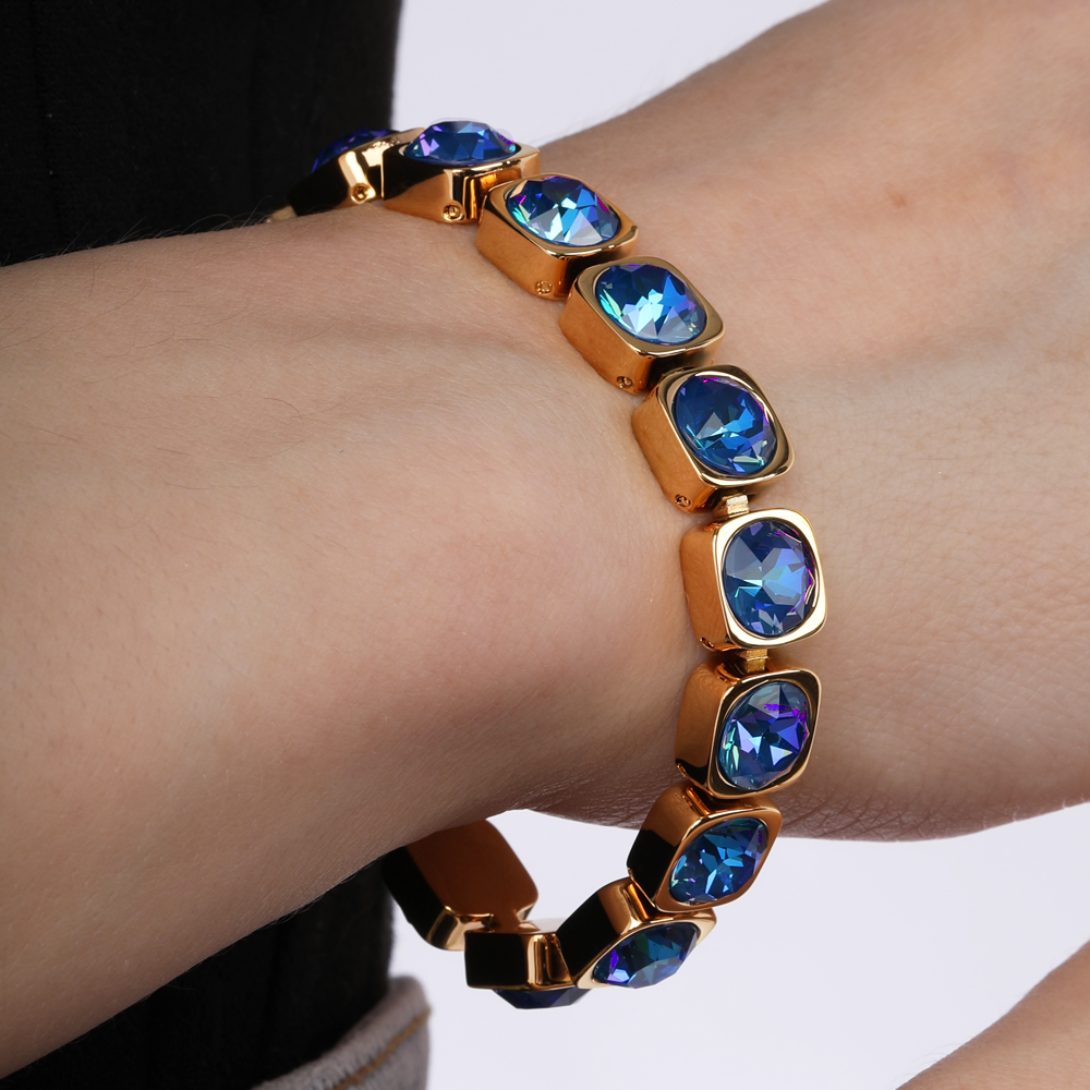 Описание: Изготовлено из ювелирного сплава на основе латуни с гальваническим покрытием золотом. Изделие украшают кристаллы SW королевского синего цвета диаметром 8мм. Длина 17-19см.