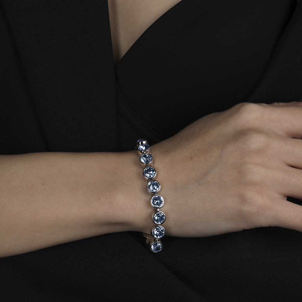 Описание: Изготовлено из ювелирного сплава на основе латуни с гальваническим покрытием родием. Изделие украшают кристаллы SW цвета светлый сапфир диаметром 6мм. Длина 18-20см.