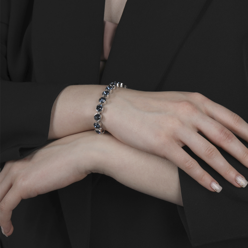Описание: Изготовлено из ювелирного сплава на основе латуни с гальваническим покрытием родием. Изделие украшают кристаллы SW темно-синего цвета диаметром 6мм. Длина 18-20см.
