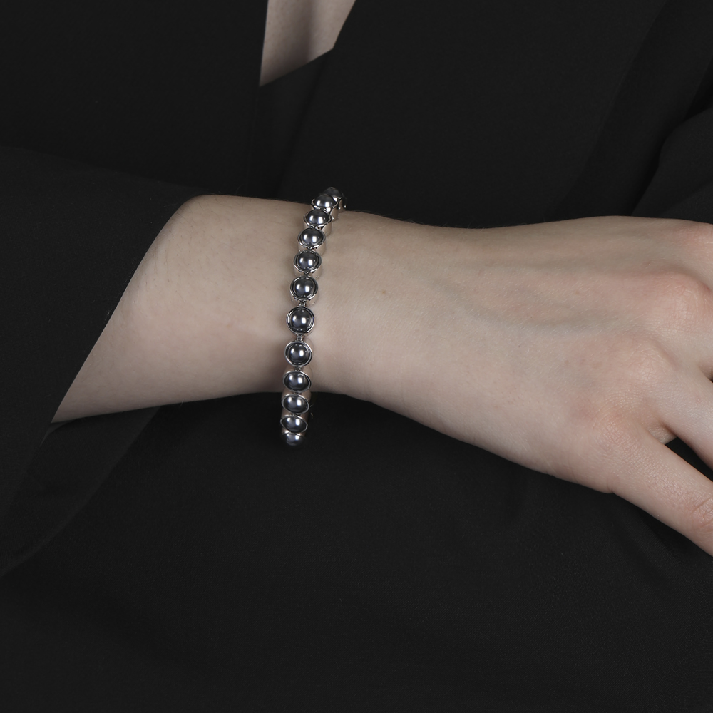 Описание: Изготовлено из ювелирного сплава на основе латуни с гальваническим покрытием родием. Изделие украшает жемчуг Майорка диаметром 6мм темно-серого цвета. Длина 18-20см.