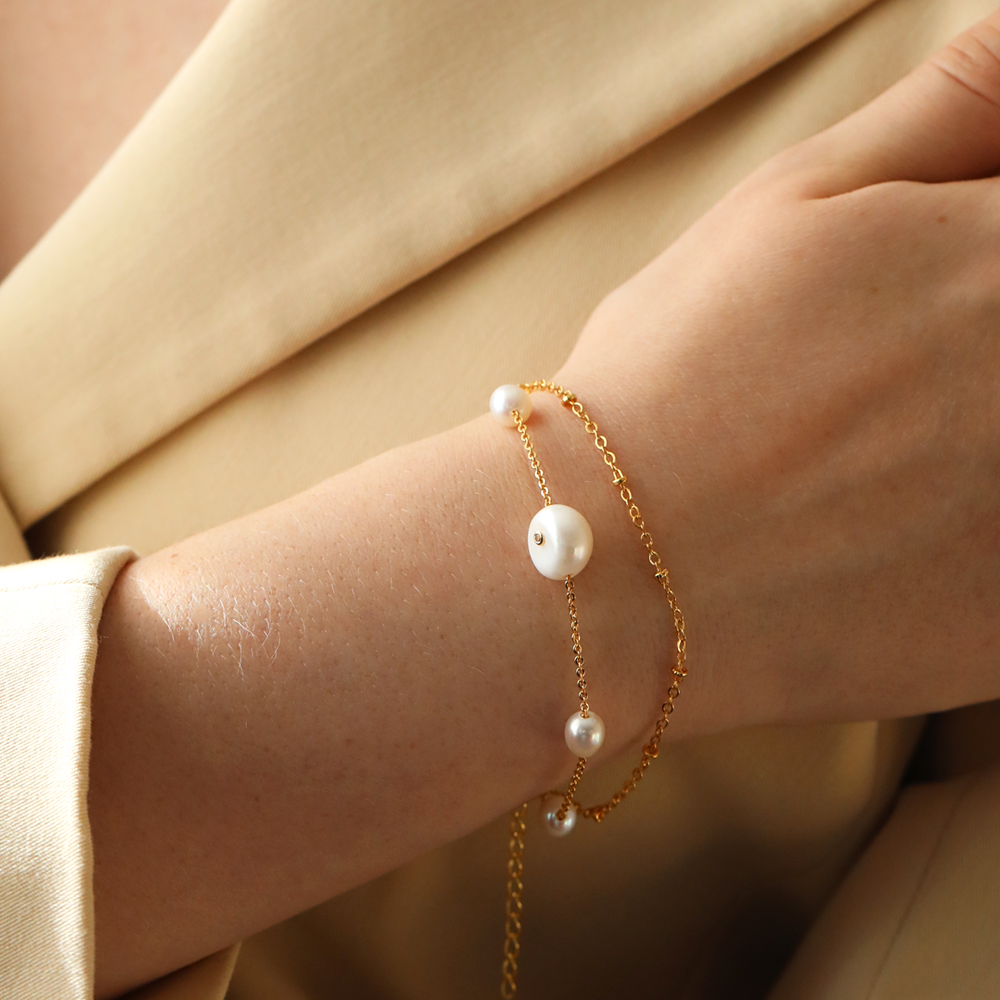Описание: Изготовлено из ювелирного сплава на основе латуни с гальваническим покрытием золотом. Изделие украшает жемчуг диаметром 7-11мм белого цвета. Длина 16см. Замок-карабин с удлинителем 4см.