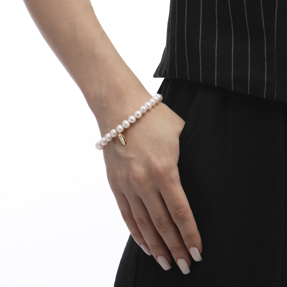 Описание: Изготовлено из ювелирного сплава на основе латуни с гальваническим покрытием золотом. Выполнено из натурального белого жемчуга высшего качества диаметром 7-8мм. Браслет на резинке.