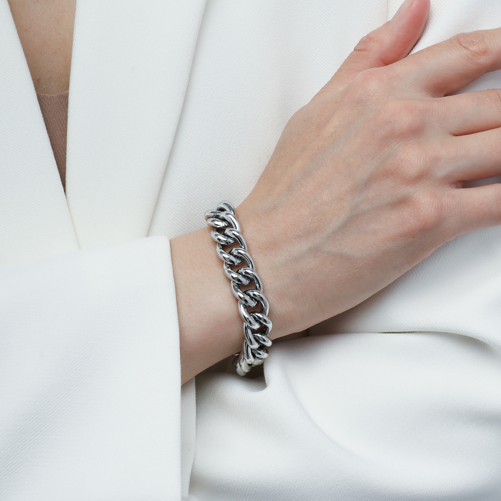 Описание: Изготовлено из облегченного сплава алюминия с гальваническим покрытием родием. Звено 13мм. Длина браслета 18см. Замок-карабин с удлинителем 3см.