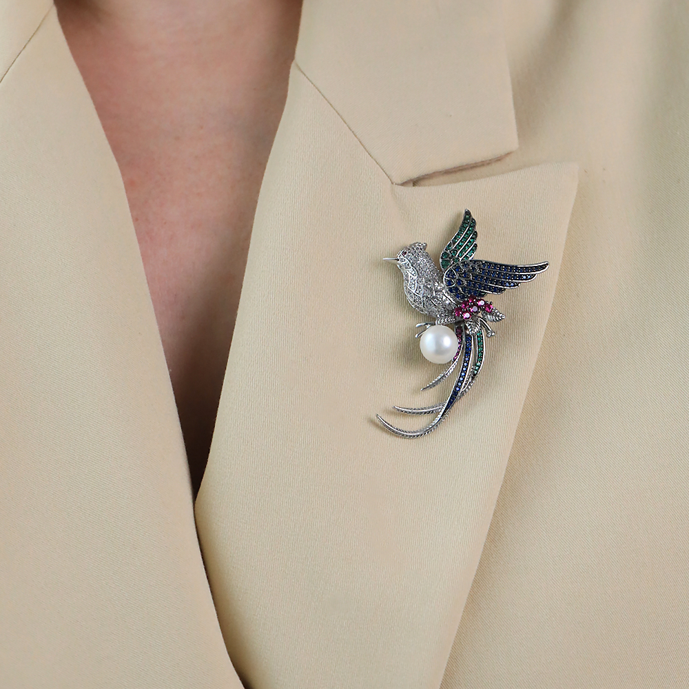 Описание: Изготовлено из ювелирного сплава на основе латуни с гальваническим покрытием родием. Изделие украшают разноцветные фианиты и натуральный жемчуг белого цвета. Размер 6.5х4.3см. Замок с задвижной гильзой.