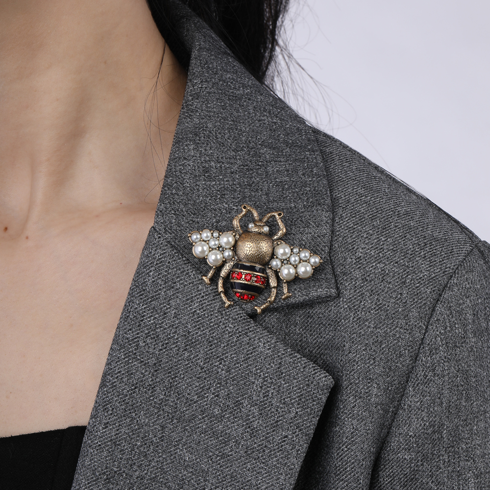 Описание: Изготовлено из ювелирного сплава на основе латуни с гальваническим покрытием античным золотом. Изделие украшают жемчуг Майорка белого цвета, черная эмаль и кристаллы красного цвета. Замок с задвижной гильзой. Размер броши 5.5х4см.