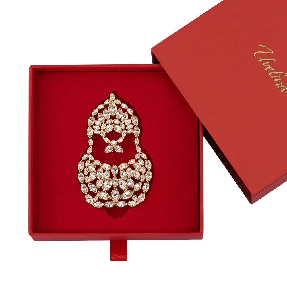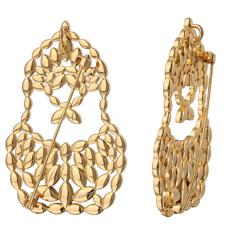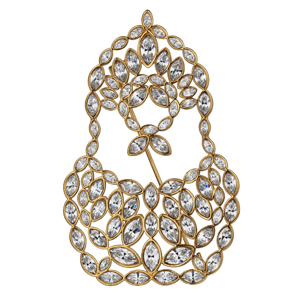 Описание: Изготовлено из ювелирного сплава на основе латуни с гальваническим покрытием золотом. Изделие украшают кристаллы SW белого цвета. Размер броши 7.5х4.5см. Замок-булавка.