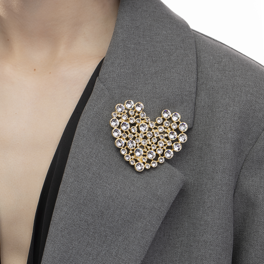 Описание: Изготовлено из ювелирного сплава на основе латуни с гальваническим покрытием золотом. Изделие украшают кристаллы SW белого цвета. Размер броши 5.3х6.2см. Замок-булавка.