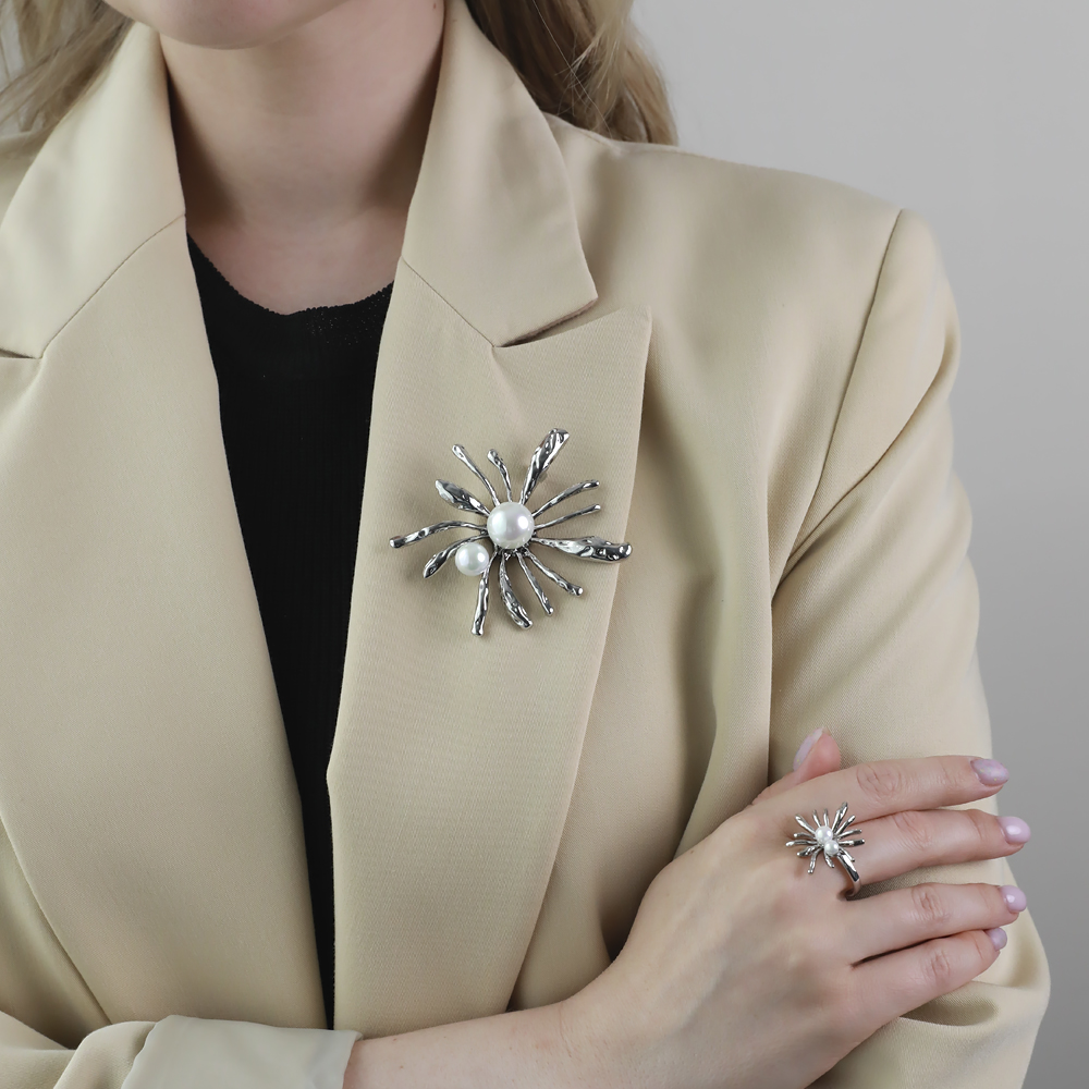 Описание: Изготовлено из ювелирного сплава на основе латуни с гальваническим покрытием родием. Изделие украшает жемчуг Майорка диаметром 12-16мм белого цвета. Размер 11х9см. Замок-английская булавка.