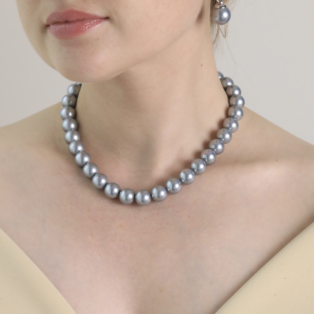 Описание: Изготовлено из ювелирного сплава на основе латуни с гальваническим покрытием родием. Изделие украшает круглый жемчуг Майорка серо-голубого цвета диаметром 12мм. Длина 38см. Шпрингельный замок с удлинителем 7см. 30 бусин.