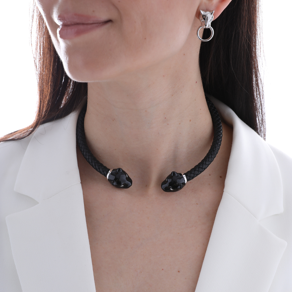Описание: Изготовлено из ювелирного сплава на основе латуни с гальваническим покрытием родием. Изделие украшают черная эмаль и кристаллы SW белого цвета. Длина колье на черном кожаном шнурке 36см.