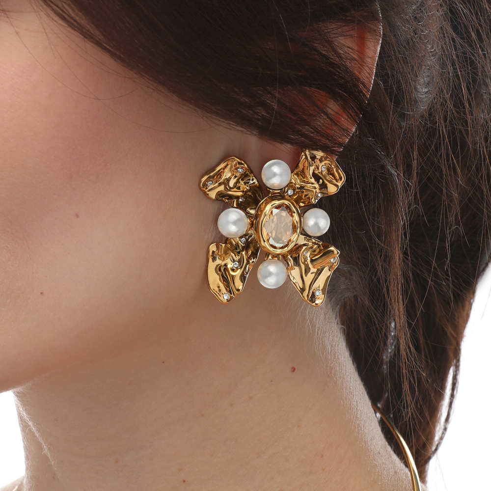 Описание: Изготовлено из ювелирного сплава на основе латуни с гальваническим покрытием золотом. Изделие украшают кристаллы SW цвета шампань и белый жемчуг Майорка. Размер украшения 4х4.5см. Серьги-клипсы.