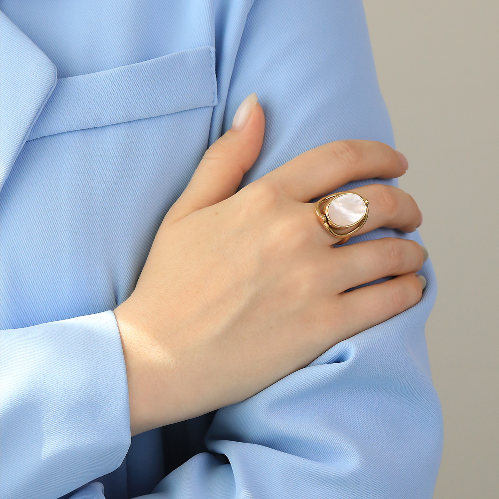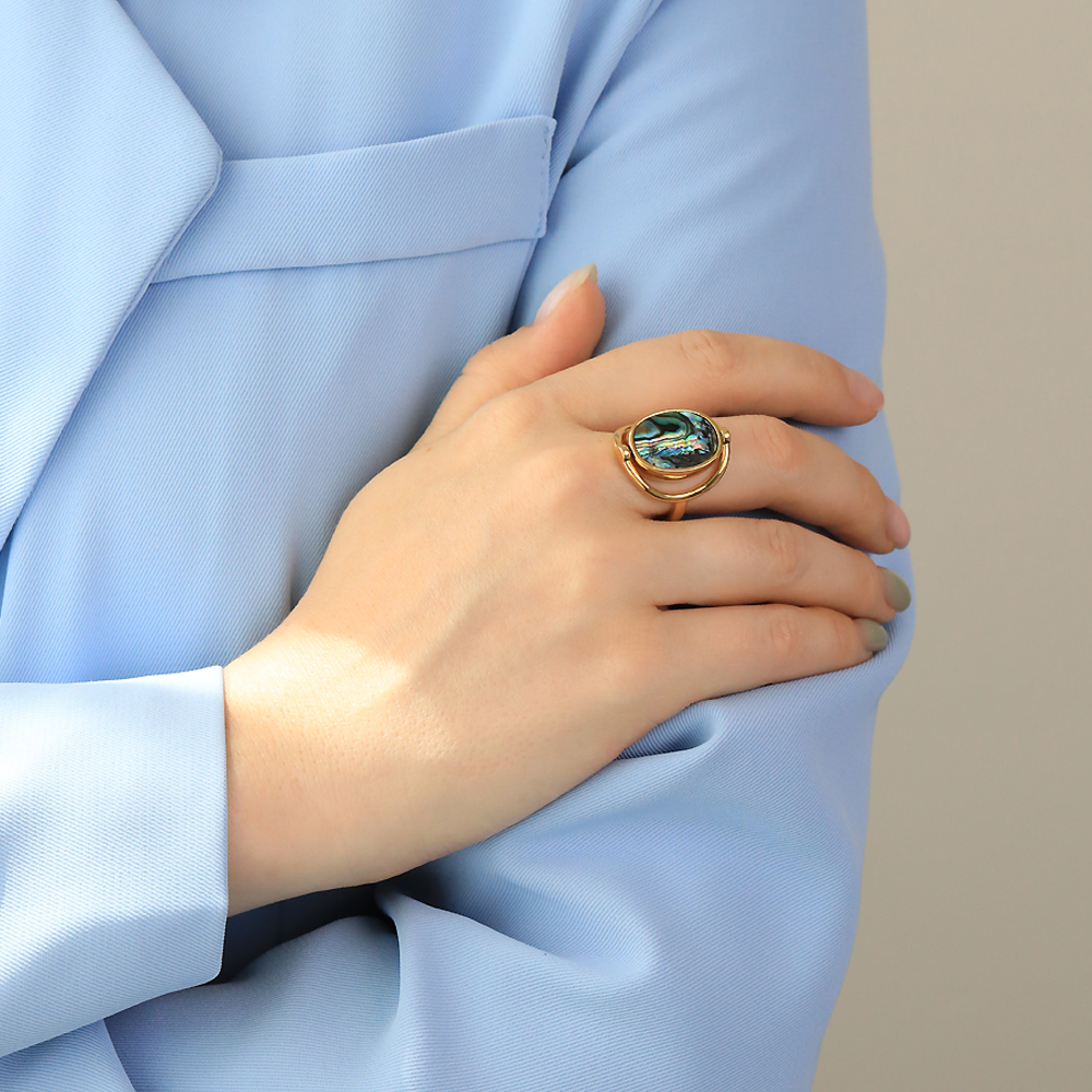 Описание: Изготовлено из ювелирного сплава на основе латуни с гальваническим покрытием золотом. Изделие украшает гелиотис и перламутр. Ширина кольца 2.5см.