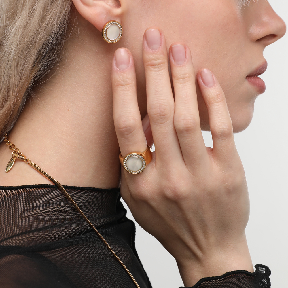 Описание: Изготовлено из ювелирного сплава на основе латуни с гальваническим покрытием золотом. Изделие украшает перламутр белого цвета. Диаметр мм.