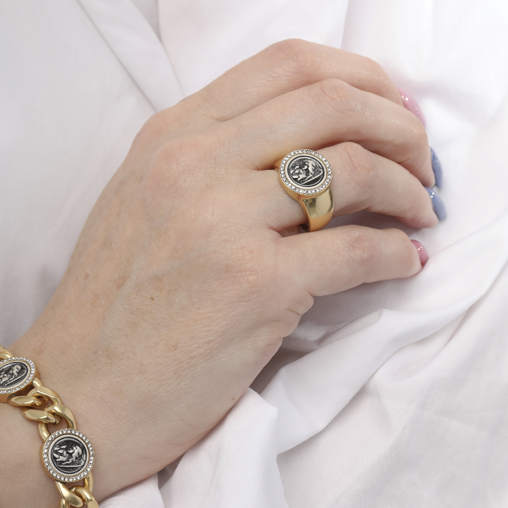 Описание: Изготовлено из ювелирного сплава на основе латуни с гальваническим покрытием античным золотом и античным серебром. Изделие украшают кристаллы SW белого цвета. Диаметр украшения 11мм.