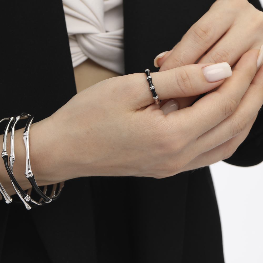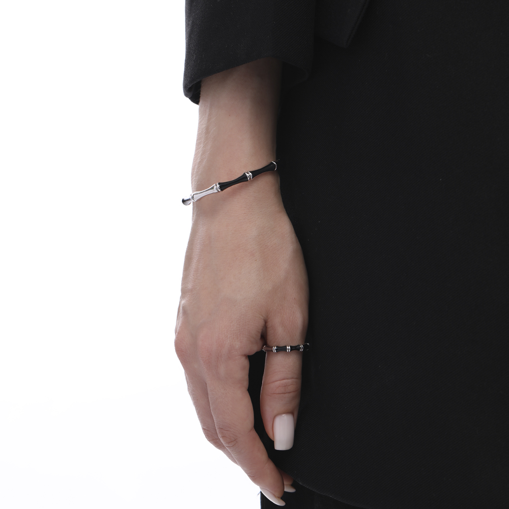 Описание: Изготовлено из ювелирного сплава на основе латуни с гальваническим покрытием родием .Изделие украшает черная эмаль. Ширина 3мм.