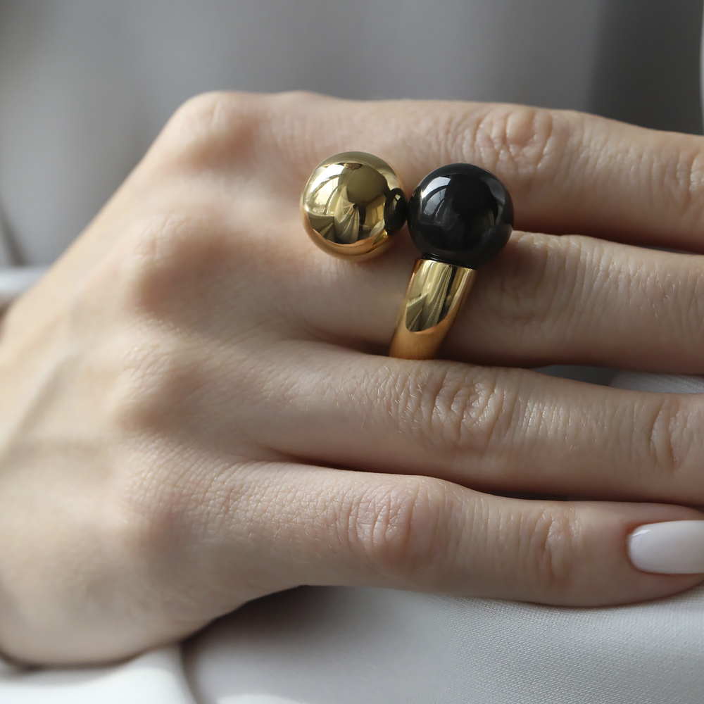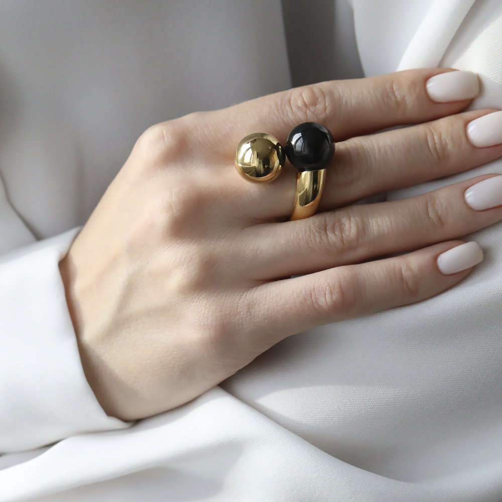 Описание: Изготовлено из ювелирного сплава на основе латуни с гальваническим покрытием золотом. Изделие украшает майорский жемчуг черного цвета диаметром 14мм.