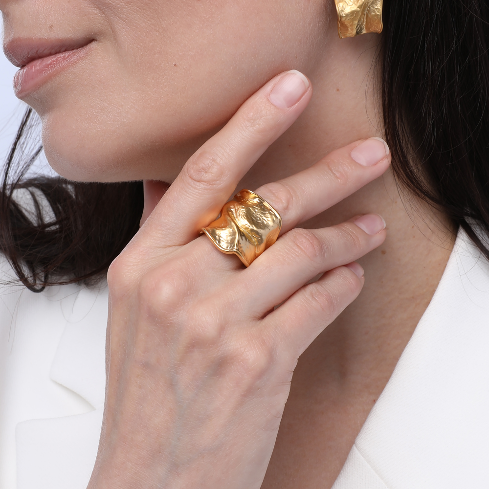 Описание: Изготовлено из ювелирного сплава на основе латуни с гальваническим покрытием матовым родием. Ширина кольца 2.8см.