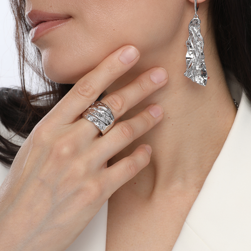 Описание: Изготовлено из ювелирного сплава на основе латуни с гальваническим покрытием родием. Ширина кольца 2см.