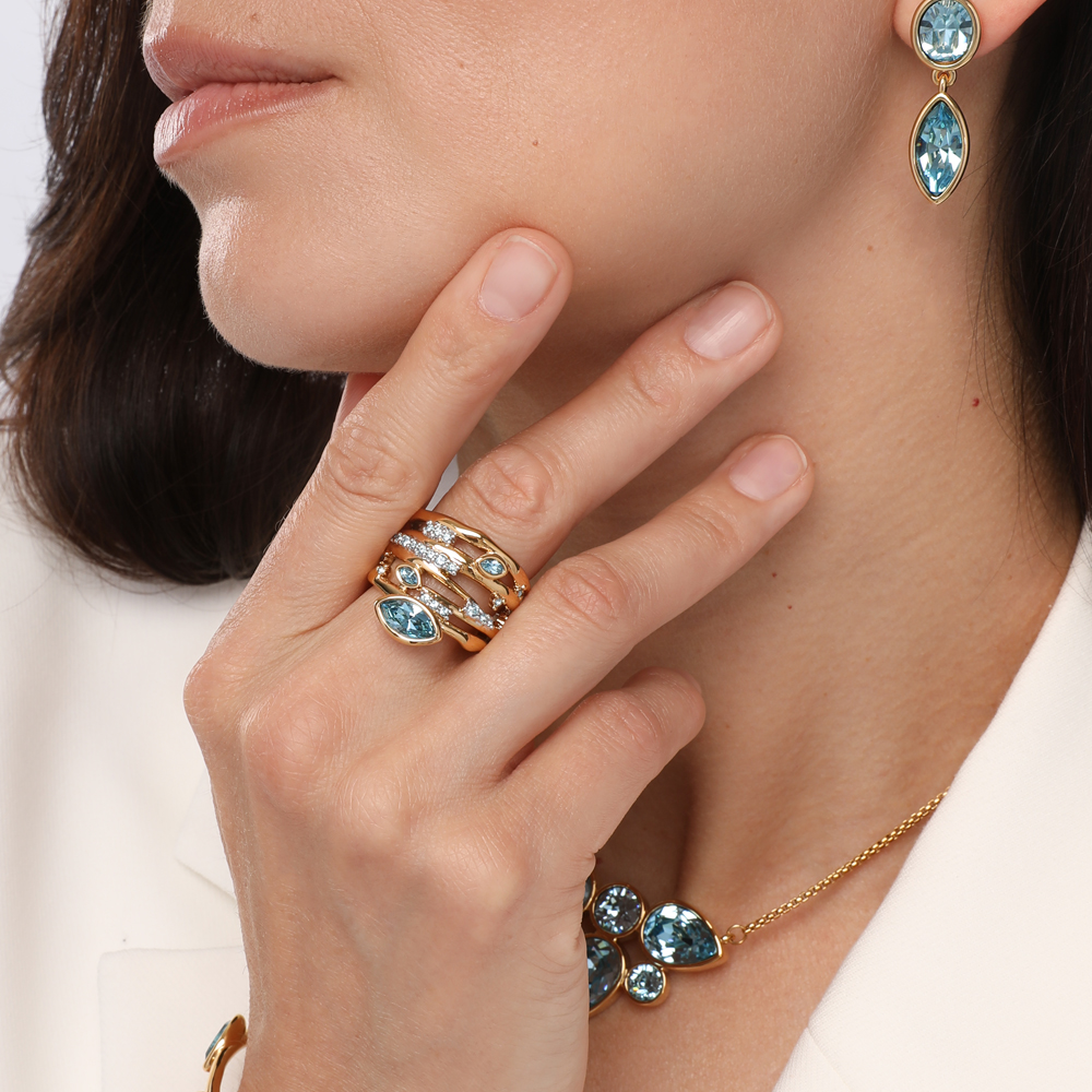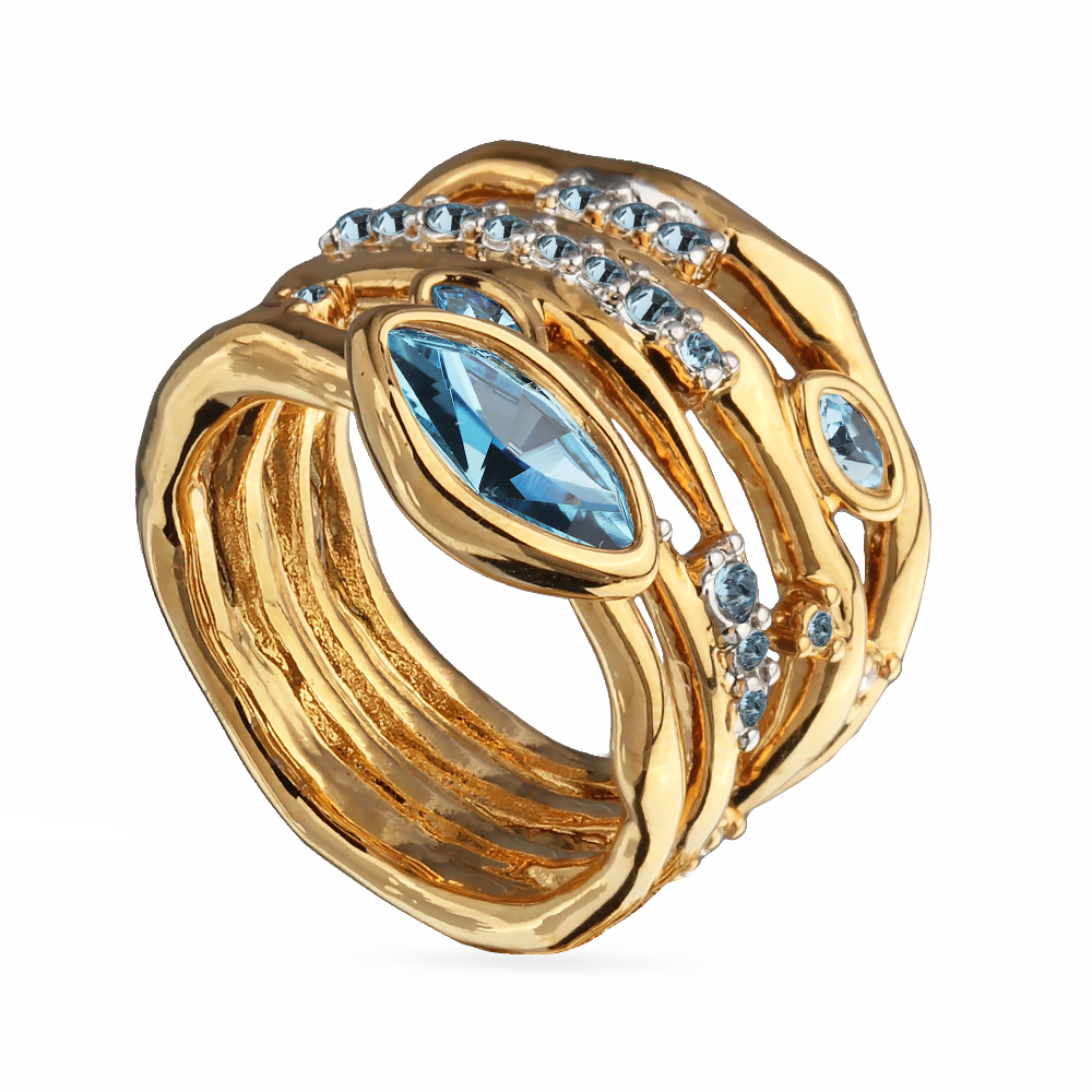 Описание: Изготовлено из ювелирного сплава на основе латуни с гальваническим покрытием золотом и родием. Изделие украшают кристаллы SW цвета аквамарин. Ширина кольца 2.1см.