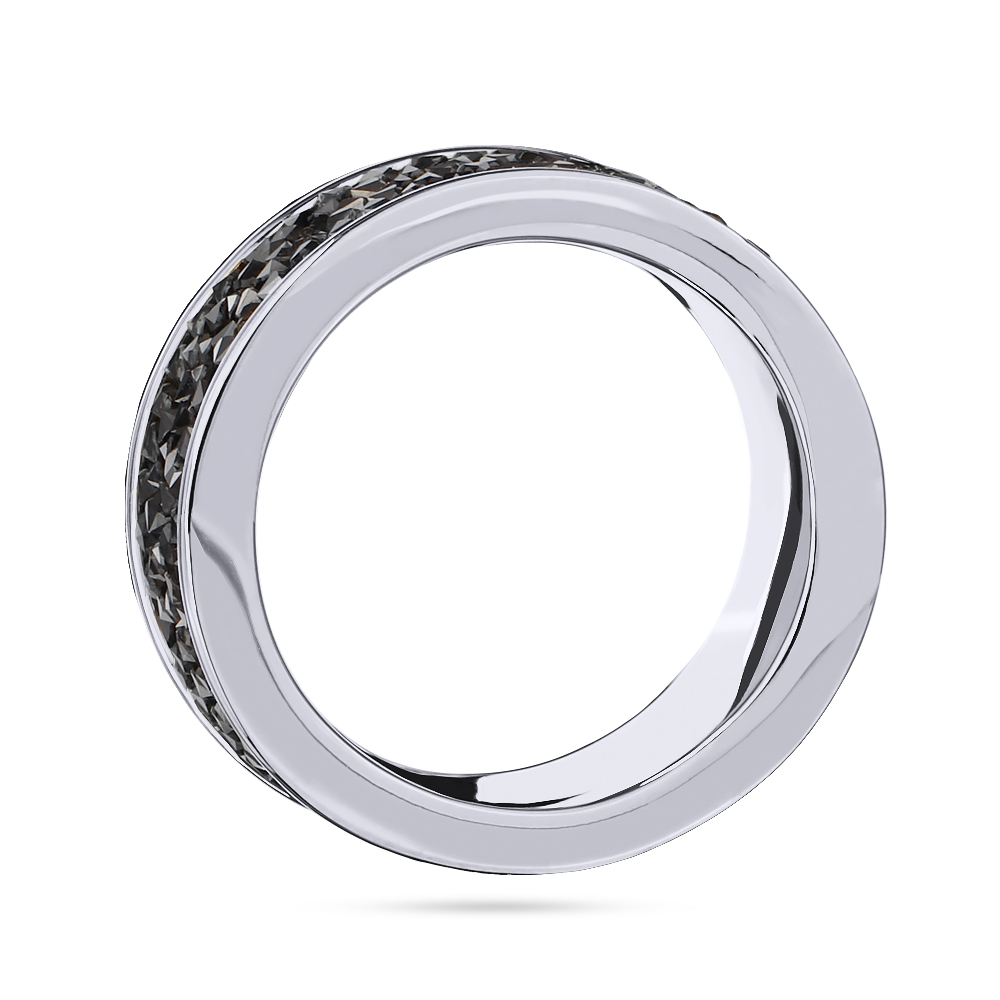 Описание: Изготовлено из ювелирного сплава на основе латуни с гальваническим покрытием родием. Изделие украшают кристаллы SW темно-серого цвета. Ширина кольца 8мм.