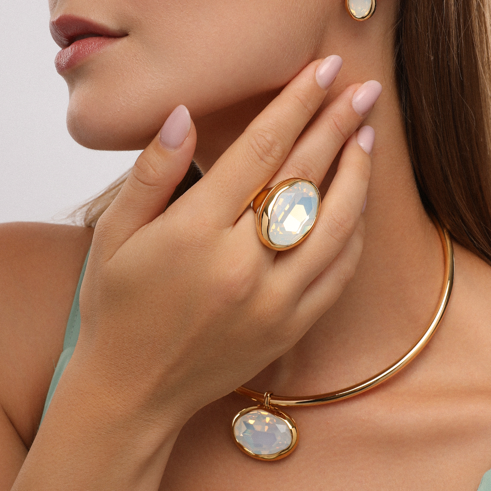 Описание: Изготовлено из ювелирного сплава на основе латуни с гальваническим покрытием золотом. Изделие украшают кристаллы SW цвета белый опал. Размер кристалла 30х22мм.