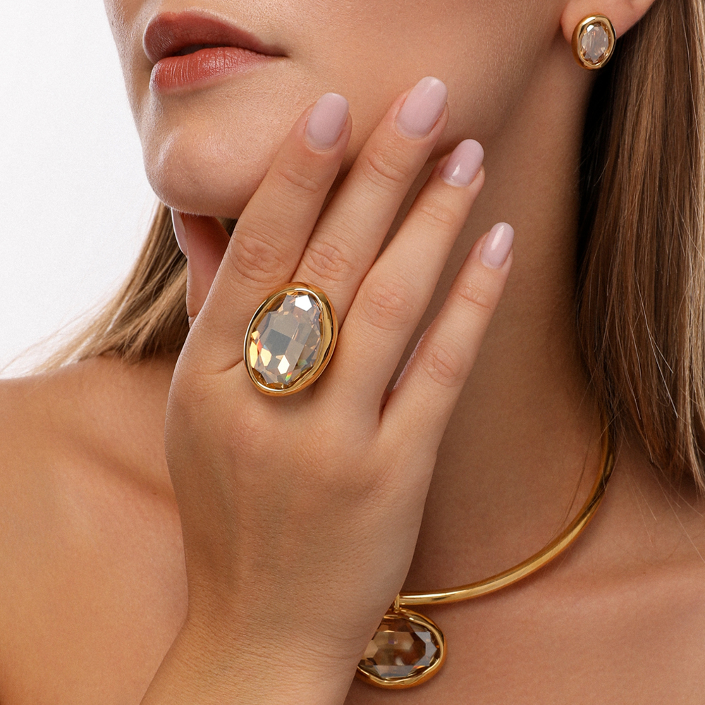 Описание: Изготовлено из ювелирного сплава на основе латуни с гальваническим покрытием золотом. Изделие украшают кристаллы SW цвета шампань. Размер кристалла 30х22мм.