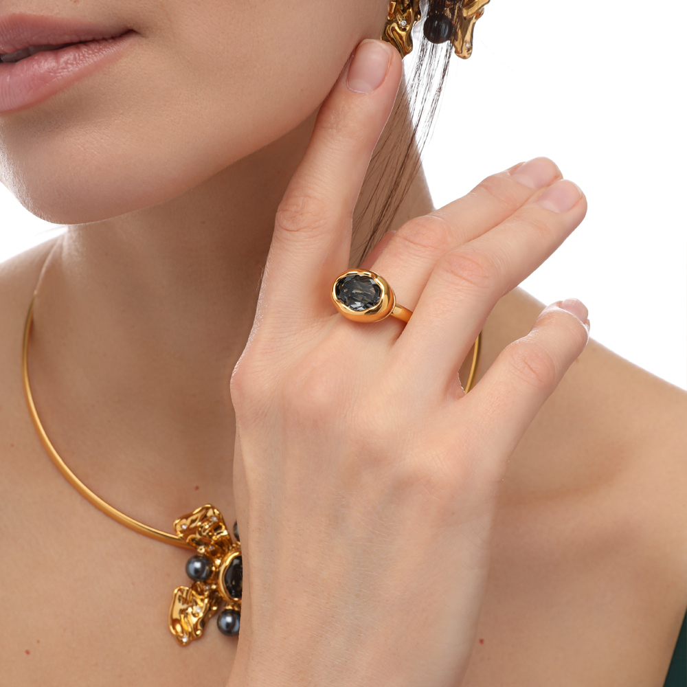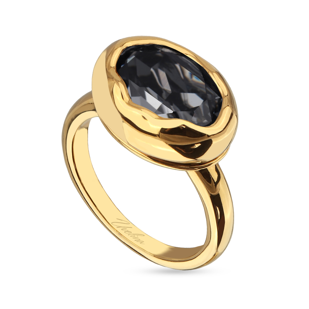 Описание: Изготовлено из ювелирного сплава на основе латуни с гальваническим покрытием золотом. Изделие украшают кристаллы SW темно-серого цвета диаметром 14мм.