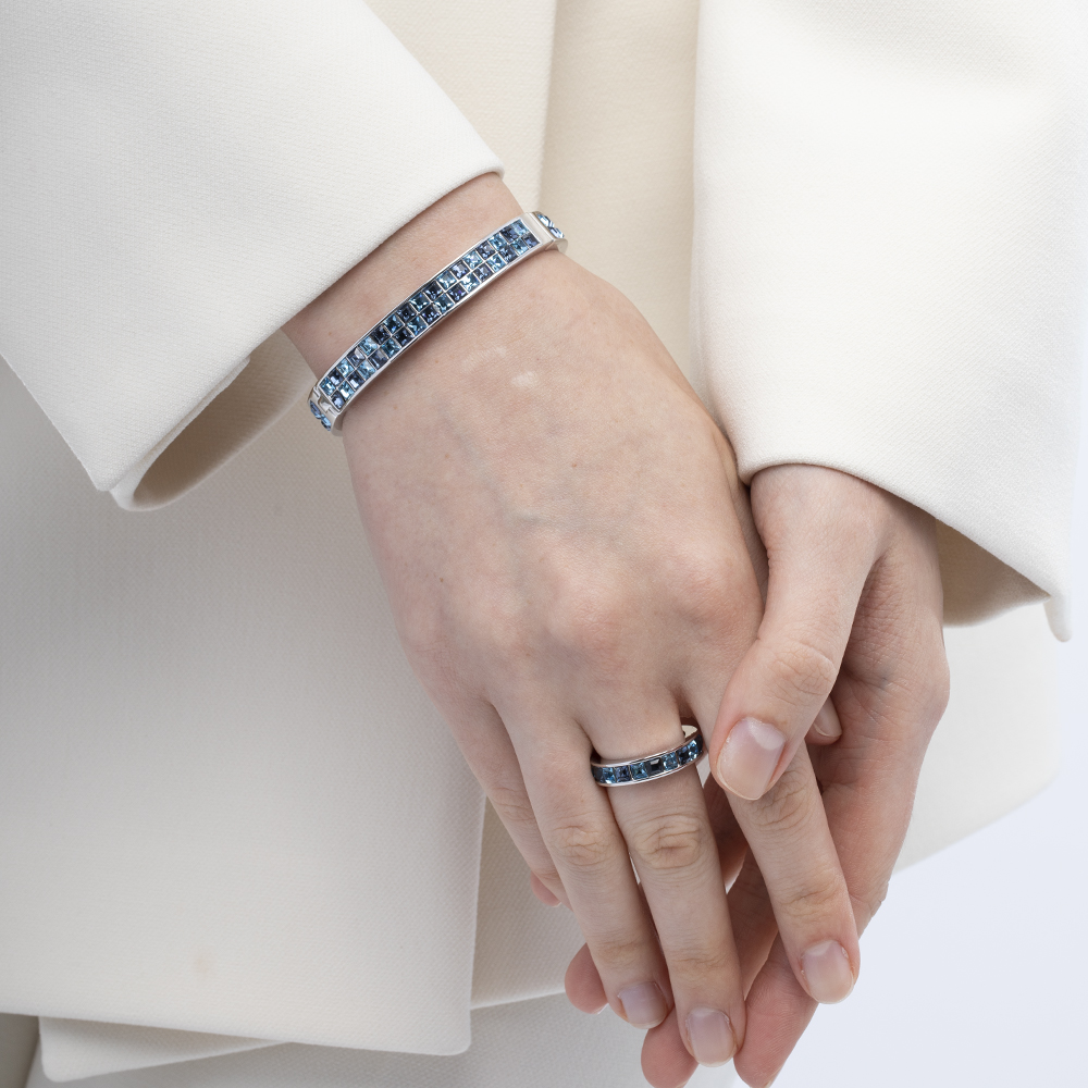 Описание: Изготовлено из ювелирного сплава на основе латуни с гальваническим покрытием родием. Изделие украшают кристаллы SW цвета джинс и аквамарин диаметром 3мм.