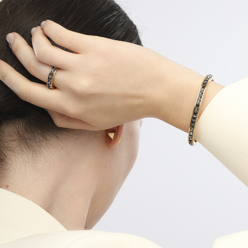 Описание: Изготовлено из ювелирного сплава на основе латуни с гальваническим покрытием золотом. Изделие украшают кристаллы SW темно-серого цвета диаметром 3мм.