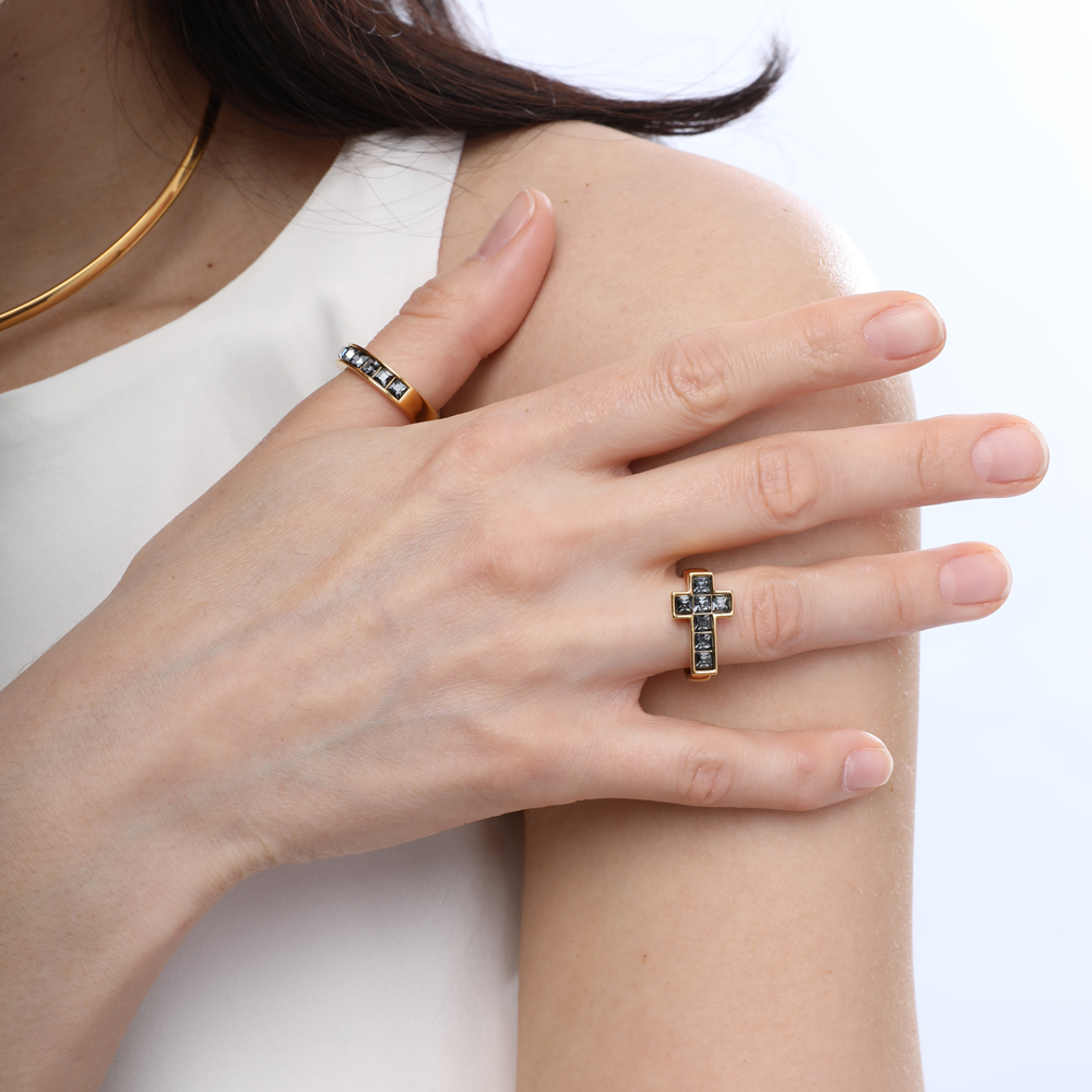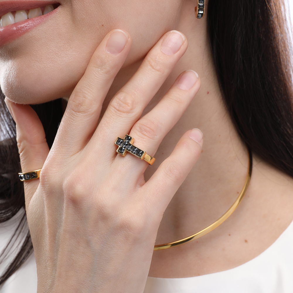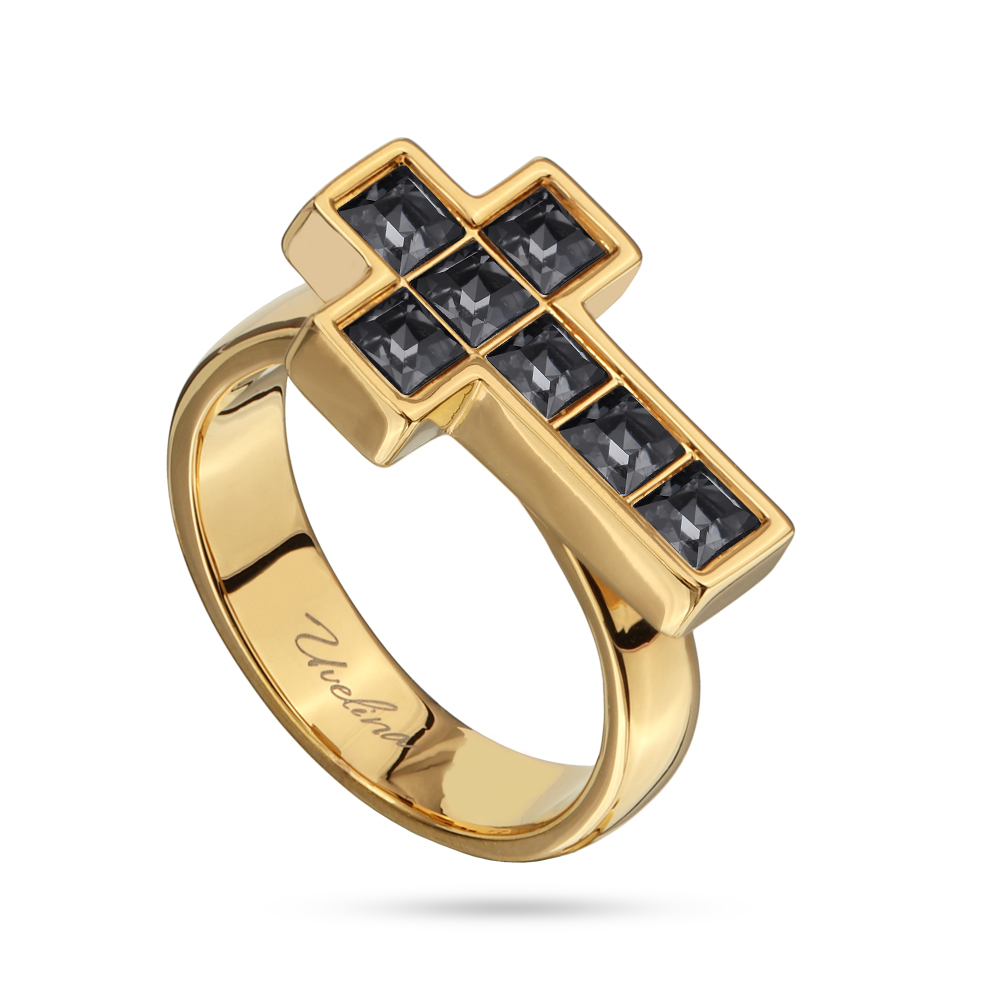 Описание: Изготовлено из ювелирного сплава на основе латуни с гальваническим покрытием золотом. Изделие украшают кристаллы SW темно-серого цвета диаметром 3мм.