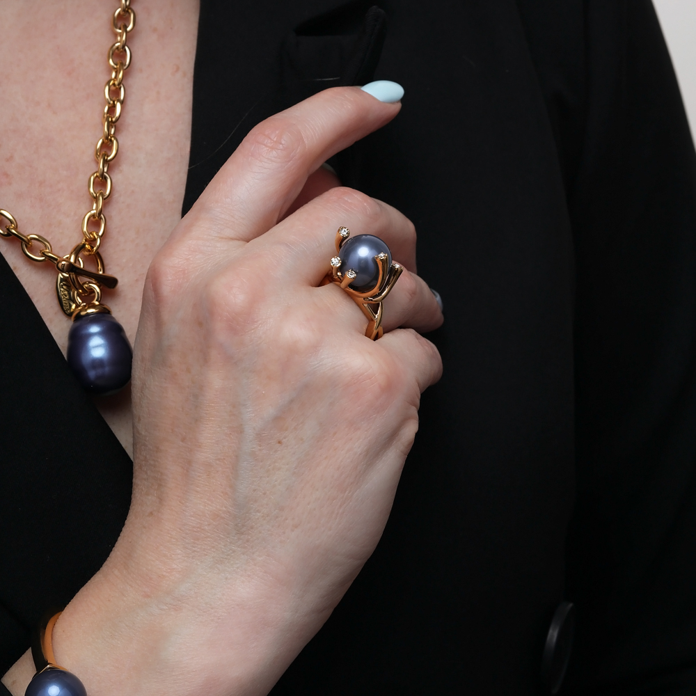Описание: Изготовлено из ювелирного сплава на основе латуни с гальваническим покрытием золотом. Изделие украшают майорский круглый жемчуг черничного цвета диаметром 14мм и кубики циркония.