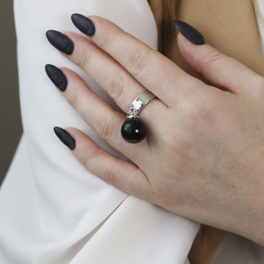 Описание: Изготовлено из ювелирного сплава на основе латуни с гальваническим покрытием родием. Изделие украшает майорский круглый жемчуг черного глянцевого цвета диаметром 14мм.